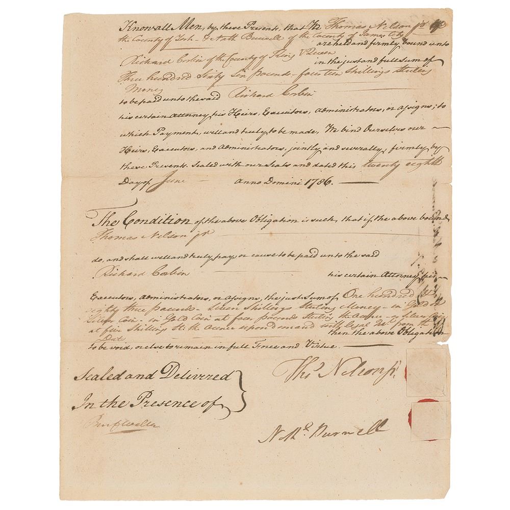 Rare manuscript DS, signed “Thos. Nelson Jr.,†one page, 7.5 x 9.25, June 28, 1786. Legal document, in part: "Know all Men, by these Presents, that Mr. Thomas Nelson, Jr,. the County of York, & Nath. Burwell…are held and firmly bound…in the just and full sum of Three hundred Sixty Six Pounds fourteen shillings sterling money." In fine condition. Accompanied by a full letter of authenticity from JSA.