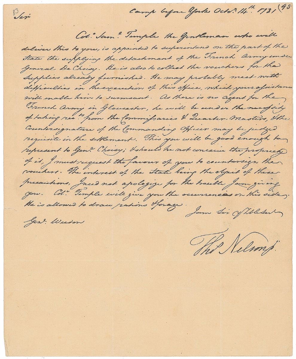 Written just days before the British surrender at Yorktown, this letter boasts desirable military content concerning France’s support of America during the Revolution. De Choisy was in command of Lauzun's Legion and General Weedon's Virginia militia and stationed in Gloucester, Virginia, during the Siege of Yorktown. His men had skirmished with Tarleton's Legion ten days earlier, although neither side suffered major casualties. Nelson was serving as governor of Virginia when he wrote this letter, a position in which he served for less than six months. His autograph is among the rarest of all Declaration signers, and examples of such high quality are hardly ever encountered.