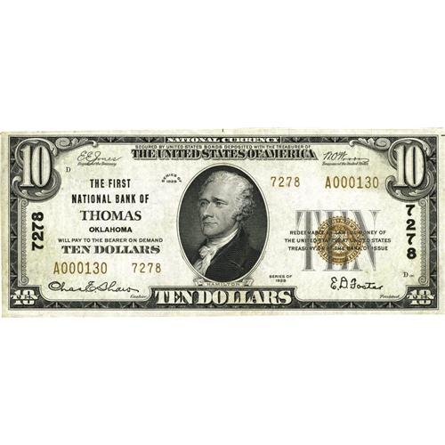 <B>Thomas, OK</B></I> - $10 1929 Ty. 2 <B>The First NB</B></I> Ch. # 7278<BR>A much above average example from this Custer County community. Sharp <B>Very Fine-Extremely Fine.</B></I>