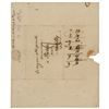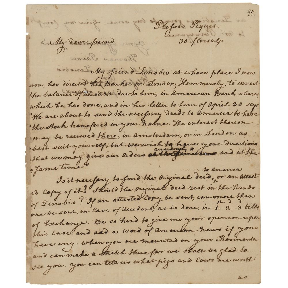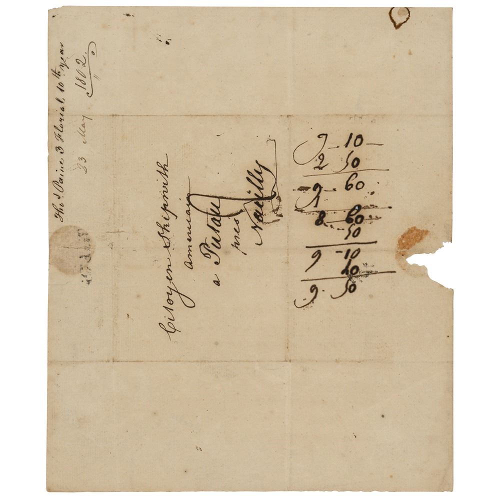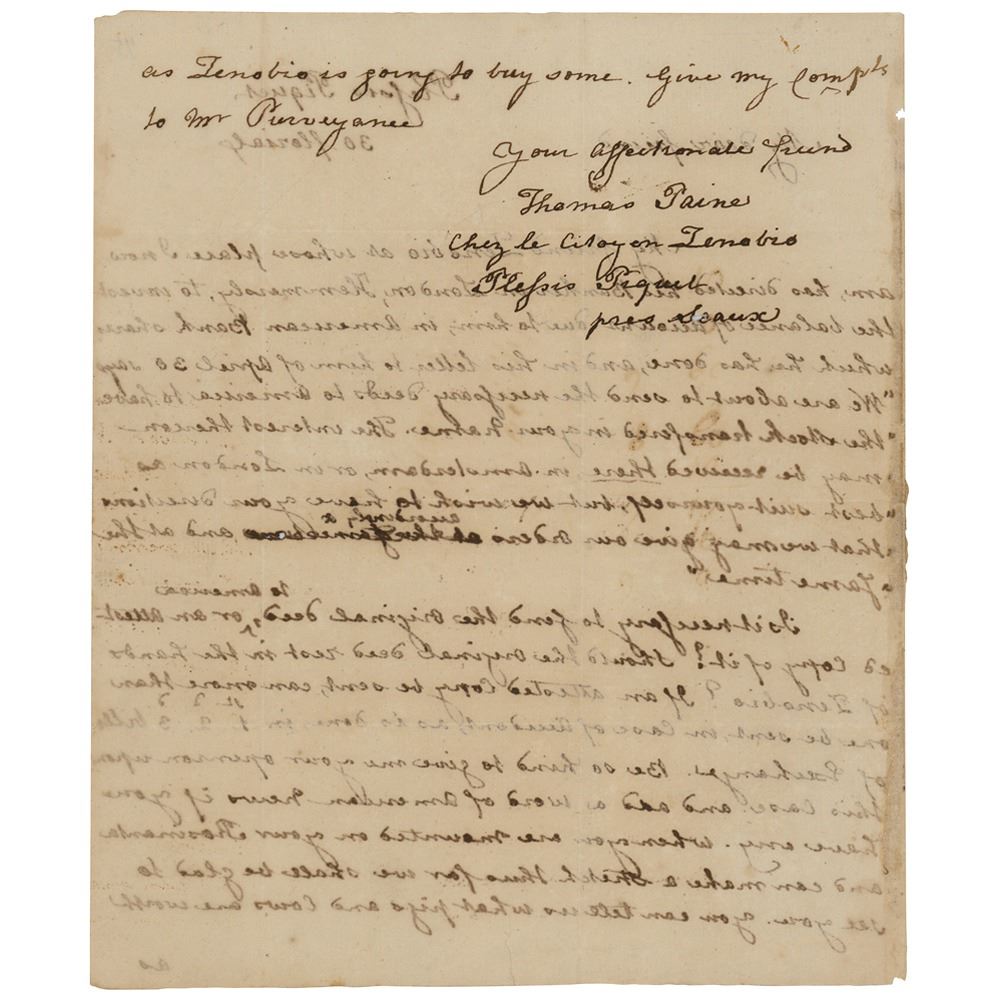 Rare ALS, signed "Thomas Paine," one page both sides, 7.5 x 9, May 23, 1802. Addressed from the Parisian village of Plessis Piquet, a handwritten letter to Fulwar Skipwith, the American consul in Versailles, which finds Paine seeking financial advice for a friend in France who is about to invest in an American bank. The letter, in full: "My friend Tenebio at whose place I now am, has directed his Banker in London, Hemmersby, to invest the balance of accounts due to him, in American Bank shares which he has done, and in his letter to him of April 30 says 'We are about to send the necessary deeds to America to have the Stock transfered in your name. The interest thereon may be received there, in Amsterdam, or in London as best suit yourself, but we wish to have your directions that we may give our orders accordingly and at the same time.' Is it necessary to find the original deed to America, or an attested copy of it? Should the original deed rest in the hands of Tenebio? If an attested copy be sent, can more than one be sent, in case of accident, as is done in 1d. 2d. 3d. bills of Exchange. Be so kind to give me your opinion upon this case, and add a word of American news if you have any. When you are mounted on your Rosinanta and can make a stretch thus far we shall be glad to see you. You can tell us what pigs and cows are worth as Tenebio is going to buy some. Give my compts to Mr. Purveyance." In fine condition, with a thin old mounting strip along the left edge of the first page, and seal-related paper loss to the integral address leaf affecting no handwriting.
