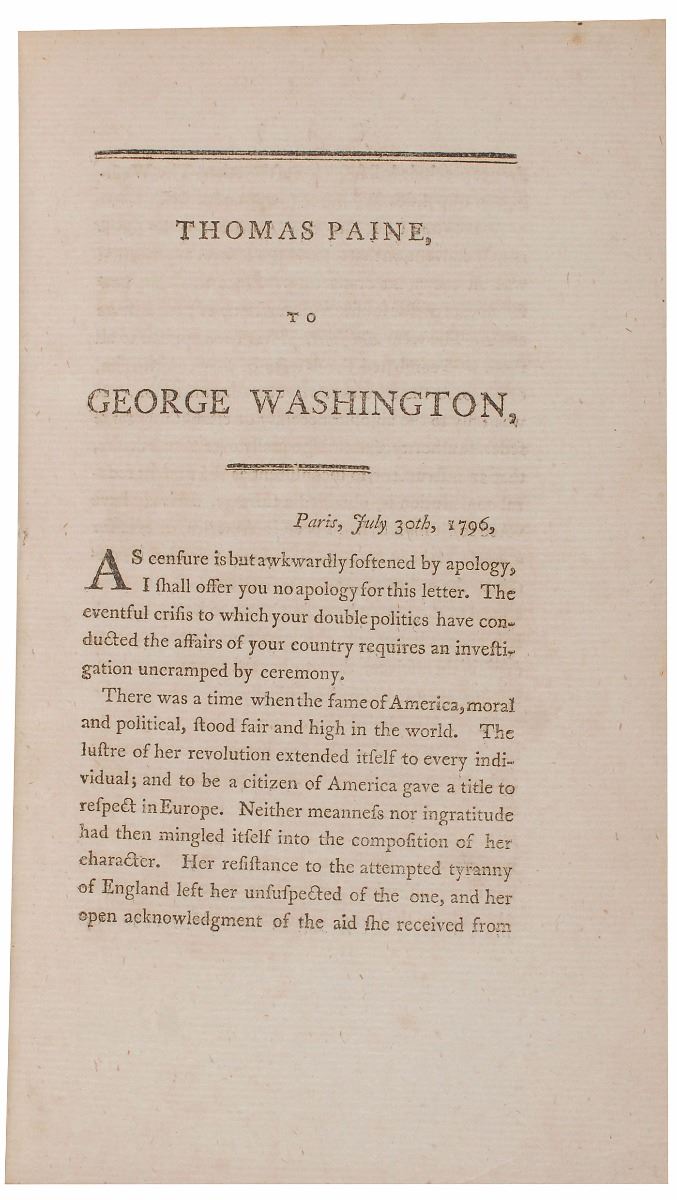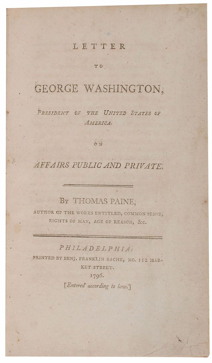 Scarce book by Thomas Paine: Letter to George Washington, President of the United States of America. First edition, first printing. Philadelphia: Benj. Franklin Bache, 1796. Rebound hardcover, 4.75 x 8, 76 pages; publisher's advertisement absent. Book condition: G/None, with front cover detached, wear to edges, and some small chips/tears to a few pages. During the French Revolution in 1793, Paine had been arrested in prison and imprisoned for nearly a year. He blamed Washington for not interceding on his behalf, and went so far as to say that the American president conspired with Robespierre to imprison him. In this scathing open letter, Paine attacks Washington as ungrateful, incompetent, and unworthy of his military and political fame. A scarce and exceedingly desirable first printing of a leading force in the philosophy of the American Revolution, made all the more interesting by its criticism of the rebellion’s greatest hero.