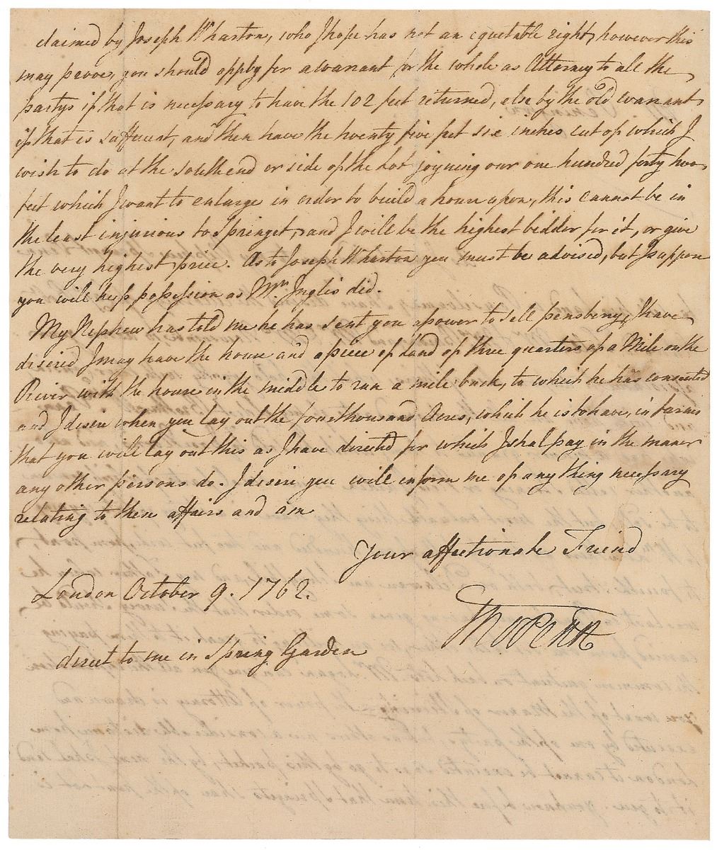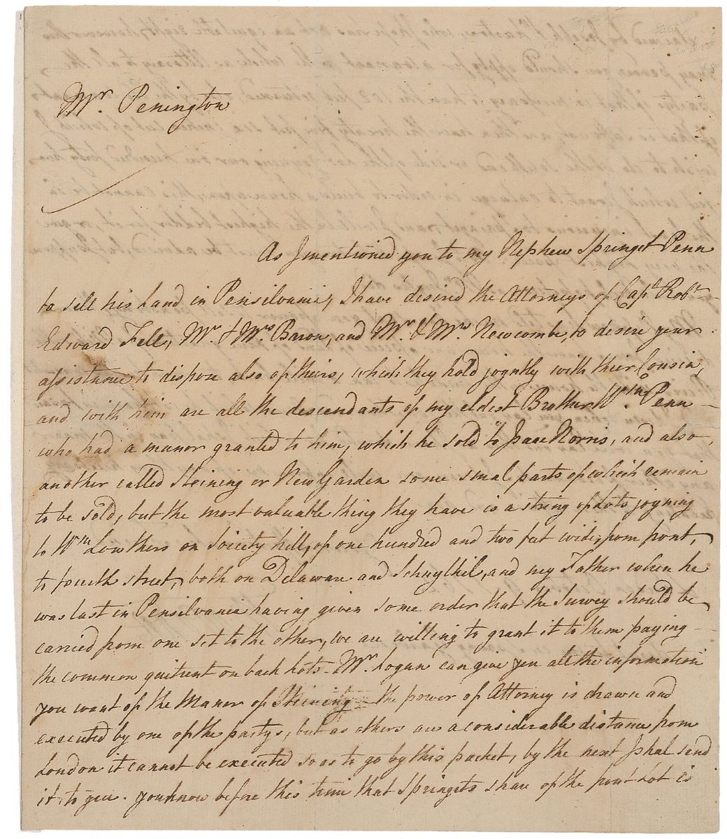 ALS signed “Tho Penn,” one page both sides, 7.5 x 9, October 9, 1762. Letter to Edward Penington in Philadelphia, in part: “As I mentioned you to my Nephew Spring’t Penn to sell his land in Pensilvania I have desired the Attorney of Capt. Robt Edward Fell, Mr. & Mrs Beson, and Mr. & Mrs. Newcombe to desire your assistance to dispose also of theirs, which they hold joyntly with their Cousin and with him on all the descendants of my eldest Brother Wm Penn who had a manor granted to him, which he sold to Isaac Norris, and also another called Steining or New Garden some smal[l] parts of which remain to be sold, but the most valuable thing they have is a string of Lots, joyning to Wm. Lowthers on Society hills of one hundred and two feet wide, from front to fourth street, both on Delaware and Schuylkil[l], and my Father when he was last in Pensilvania having given some order that the Survey should be carried from one lot to the other, we are willing to grant it to them paying the common quitrent on back lots. Mr. Logan can give you all the information you want of the Manor of Steining the power of Attorney is drawn and executed by one of the partys, but as others are a considerable distance from London it cannot be executed so as to go by this packet, by the next I shall send it to you. You knew before this time that Springett’s share of the front lot is claimed by Joseph Wharton, who I hope has not an equitable right, however this may prove…My Nephew has told me he has sent you a power to send pen[n]sbury [Manor], I have desired I may have the house and a piece of land of three quarters of a Mile on the River with the house in the middle to run a mile back, to which he has consented and I desire when you lay out the four thousand acres, which he is to have, in farms that you will lay out this as I have directed for which I shal[l] pay in the manner any other persons do. I desire you will inform me of any thing necessary relating to these affairs.” Addressed on the reverse of the second integral page in Penn’s own hand. Intersecting folds, some scattered light toning, tape remnant to hinge, and a repair to second integral page, otherwise fine condition.