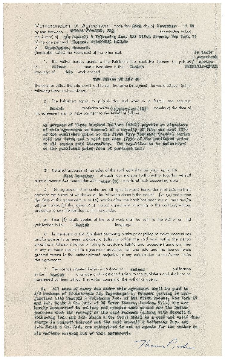 DS, signed “Thomas Pynchon,” one page, 7.75 x 12.75, November 24, 1966. Memorandum of an agreement in which Pynchon grants the publishing company Gyldendal Forlag license to publish a Danish translation of his book The Crying of Lot 49 for “an advance of Three Hundred Dollars…payable on signature of this agreement on account of a royalty of Five per cent…of the published price on the first Five Thousand…copies sold and Seven and a half percent…of the published price on all copies sold thereafter.” Signed at the conclusion in blue ballpoint by Pynchon. In fine condition.