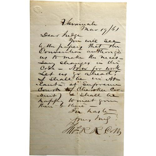 <B>Thomas Reade Rootes Cobb Autograph Letter Signed</B></I> “<I>Tho. R. R. Cobb</B></I>” One page, 5.5” x 9”, Savannah, Georgia, March 19, 1861, in ink, to “<I>Dear Judge</B></I>”. A letter that references a change made to the Confederate constitution ratified in Montgomery, Alabama eight days earlier on March 11, 1861. The letter reads in full: “<I>Dear Judge, You will see by the papers that the Convention authorized us to make the necessary changes in the code- Now for work let us go ahead! I shall be in Atlanta at Supreme Court (Cherokee Circuit) I shall be happy to meet your then & there- In haste- Yours Truly Tho. R. R. Cobb</B></I>”. When Georgia seceded from the Union on January 19, 1861, Cobb was elected to the Provincial Congress of the Confederate States of America in Montgomery, Alabama, and served on the committee that drafted the Confederate constitution. The original manuscript is believed to be in his handwriting. In the late summer of 1861, he organized Cobb's Legion. The Legion was assigned to the Army of Northern Virginia and sustained heavy losses in the Maryland Campaign. Cobb was promoted to Brigadier General on November 1, 1862. He was wounded at Fredericksburg on December 13, 1862 and bled to death on the field of battle. Slightly toned with previous fold crease, else very good condition.<BR><BR><b>Shipping:</b> Flat Material, Small (<a target="_blank" href="http://www.heritageauctions.com/common/shipping.php">view shipping information</a>) <BR><BR><B>Important notice: