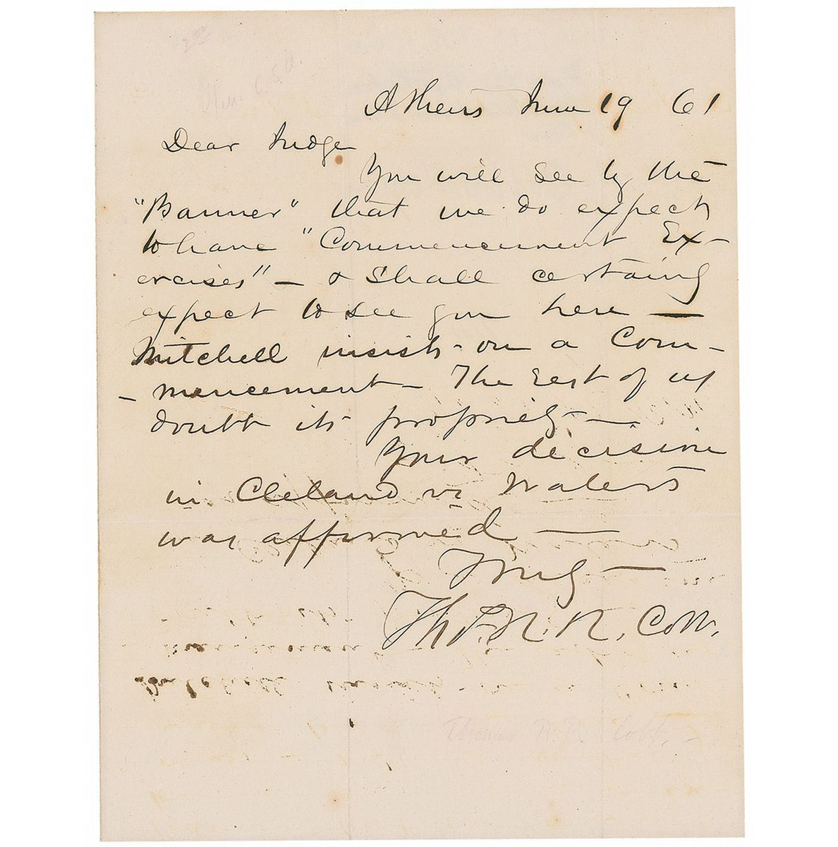 Member of the committee in the Confederate Congress that drafted their constitution, and military officer who organized ‘Cobb's Legion’ and was mortally wounded in the thigh at the Battle of Fredericksburg (1823–1862). Civil War–dated ALS signed “Thos. R. R. Cobb,” one page, 6.25 x 8, June 19, 1861. Letter to a judge. In full: “You will see by the ‘Banner’ that we do expect to have ‘Commencement Exercises’—& shall certainly expect to see you here—Mitchell insists on a commencement—The rest of us doubt its propriety. Your decision in Cleland vs. Waters was approved.” Second integral page is professionally inlaid into a slightly larger sheet. In fine condition, with intersecting folds and some mirroring to ink. Cobb is likely referring to the commencement of the the University of Georgia School of Law, which he helped to found—with the recent outbreak of war, it may not have seemed appropriate to hold a graduation ceremony with the usual fanfare. A rare and desirable letter from the influential Confederate killed in the early stages of the war.