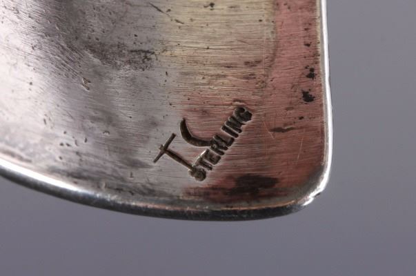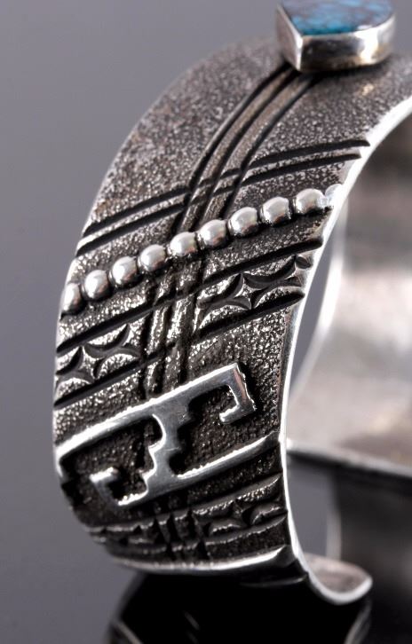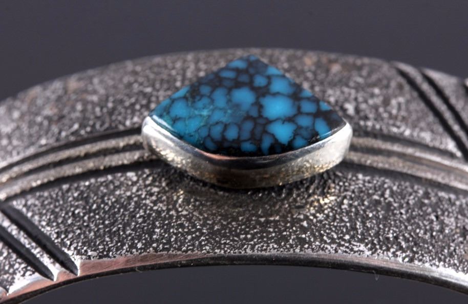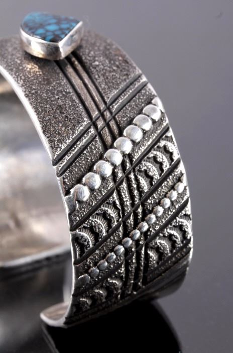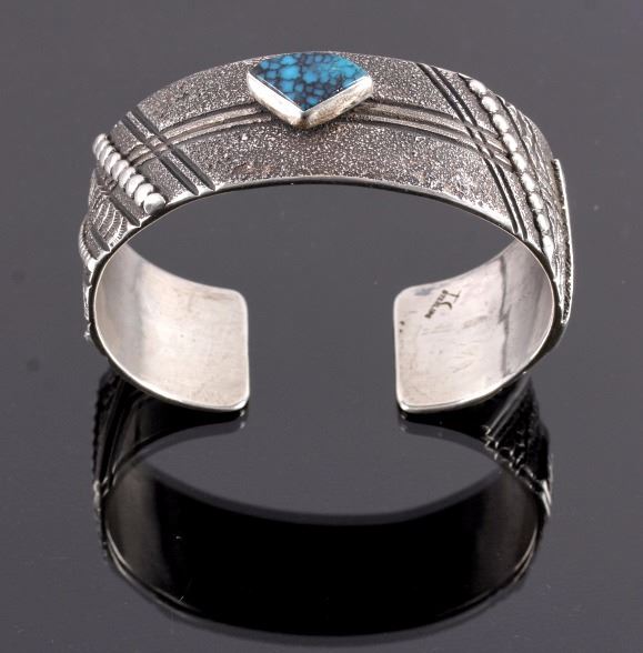 This is a Navajo Native American Indian sterling silver and turquoise cuff made by Thomas Singer. The cuff is made from solid sterling silver and features a Red Mountain Turquoise cabochon in the center. The back of the cuff is marked "Sterling" and is signed "TS". The Navajo cuff is in good condition. It measures 2" x 2.5" and is 1" wide.