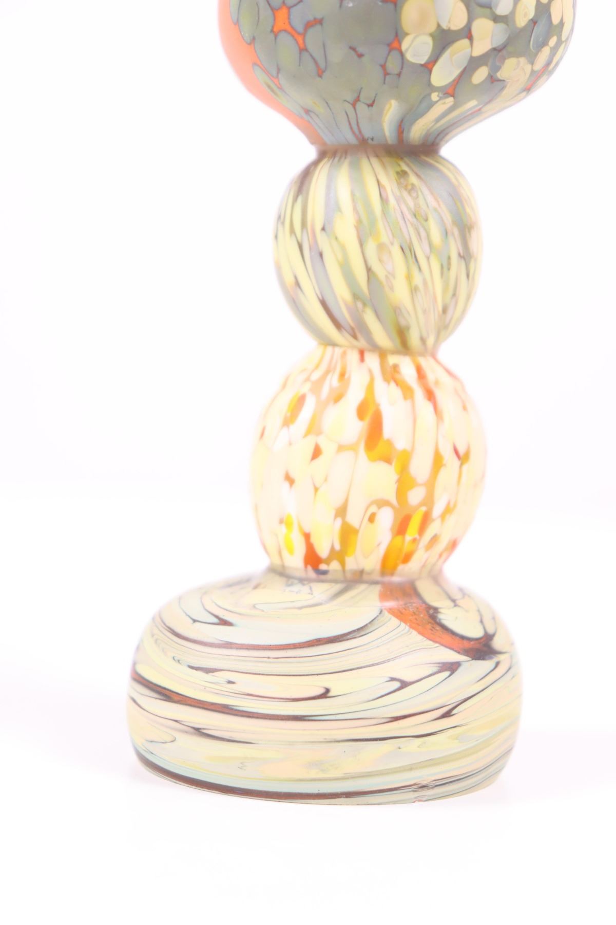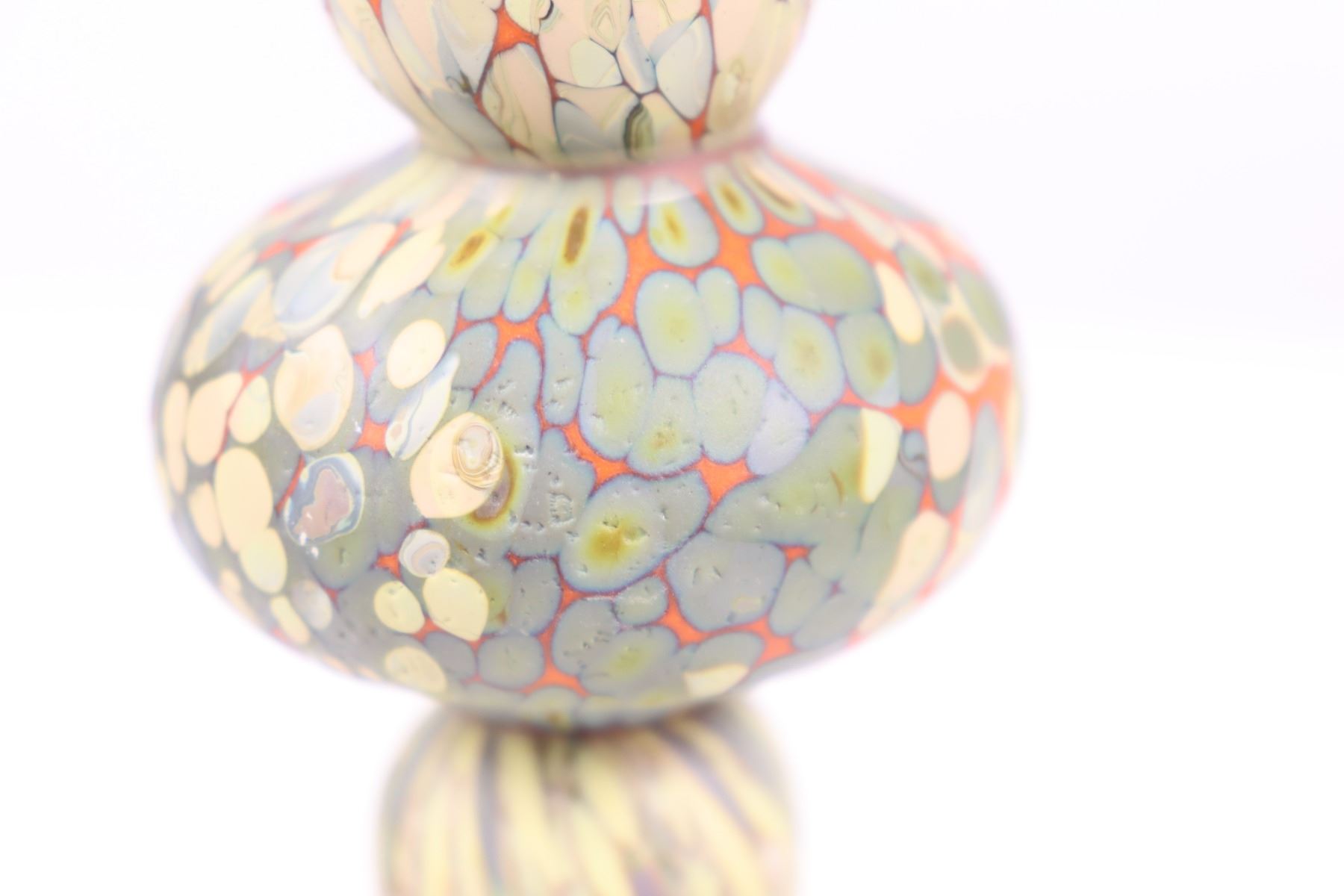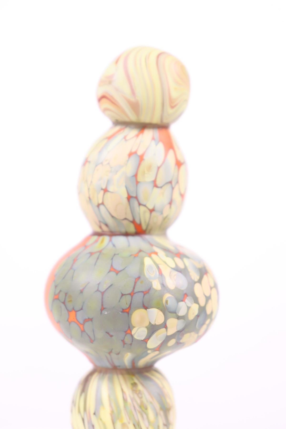 Each glass stone is made individually, based off a stone that he has collected while hiking. He uses a recipe of tiny colored glass chips to mimic stones from his collection. During creation, the glass stones are heated in a kiln to 1200 degrees and picked up, one at a time, on a base glass stone, and then heated and manipulated to enhance the unearthed look.