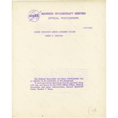 <B>Thomas Stafford Signed Color Photograph,</B></I> 8" x 10", "<I>To Joe Garino/ with best wishes/ and many thanks/ for all of the help/ in the physical/ training dept./ Thomas P. Stafford.</B></I>" <I>From the collection of renowned former physical trainer of the astronauts Joe Garino. This lot is accompanied by a signed certificate of authentication from Garino verifying its provenance.</B></I> <BR><BR><b>Shipping:</b> Flat Material, Small (<a target="_blank" href="http://www.heritageauctions.com/common/shipping.php">view shipping information</a>)