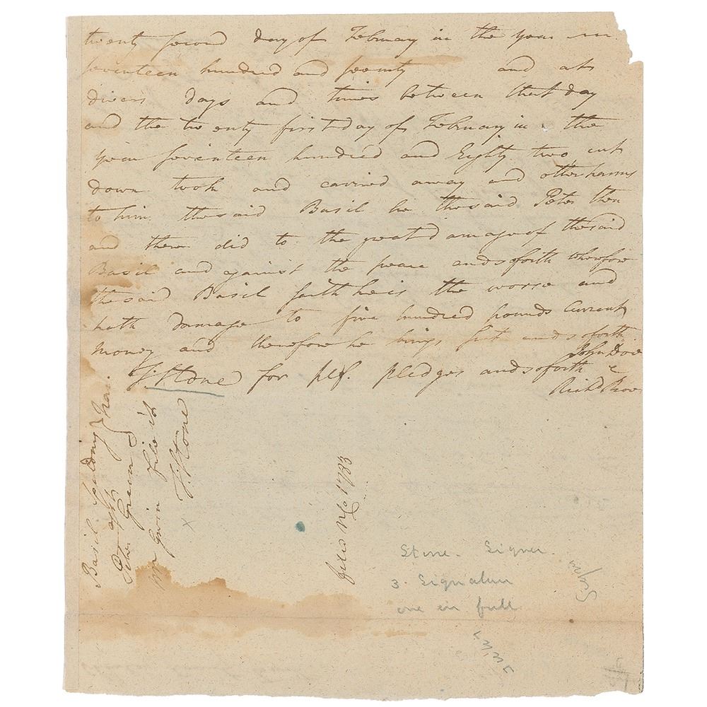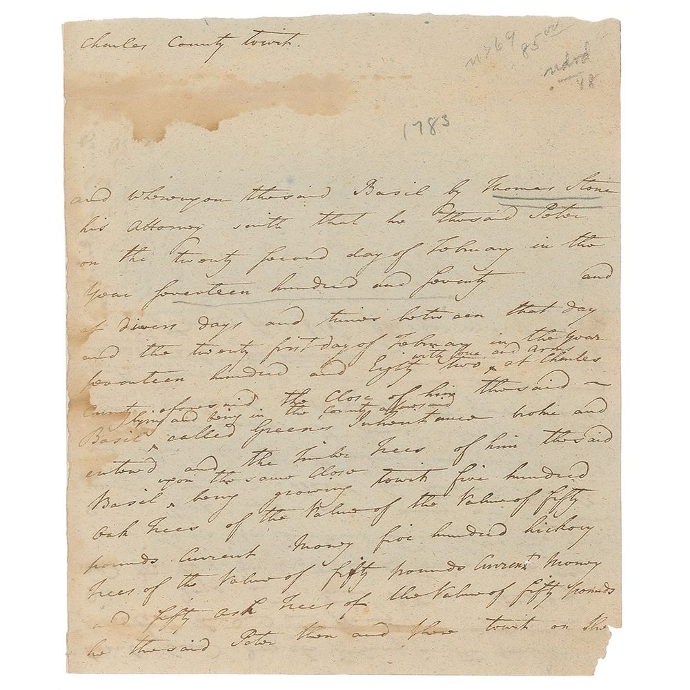Rare third-person triple-signed partial ADS, signed once, “Thomas Stone,†and twice, "T. Stone," one page both sides, 6 x 7.25, 1783. Stone pens a legal document regarding oak trees in Charles County, in part: "And whereupon the said Basil by Thomas Stone his attorney saith that…growing to wit five hundred oak trees of the value of fifty pounds current money…the said Peter then and there to wit…cut down took and carried away and other harms to him…T. Stone for plf pledges…Basil Spalding agst Peter Green…T. Stone." In very good to fine condition, with trimmed edges and light staining.