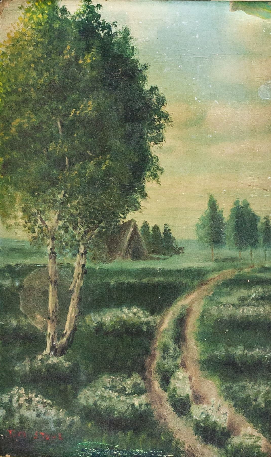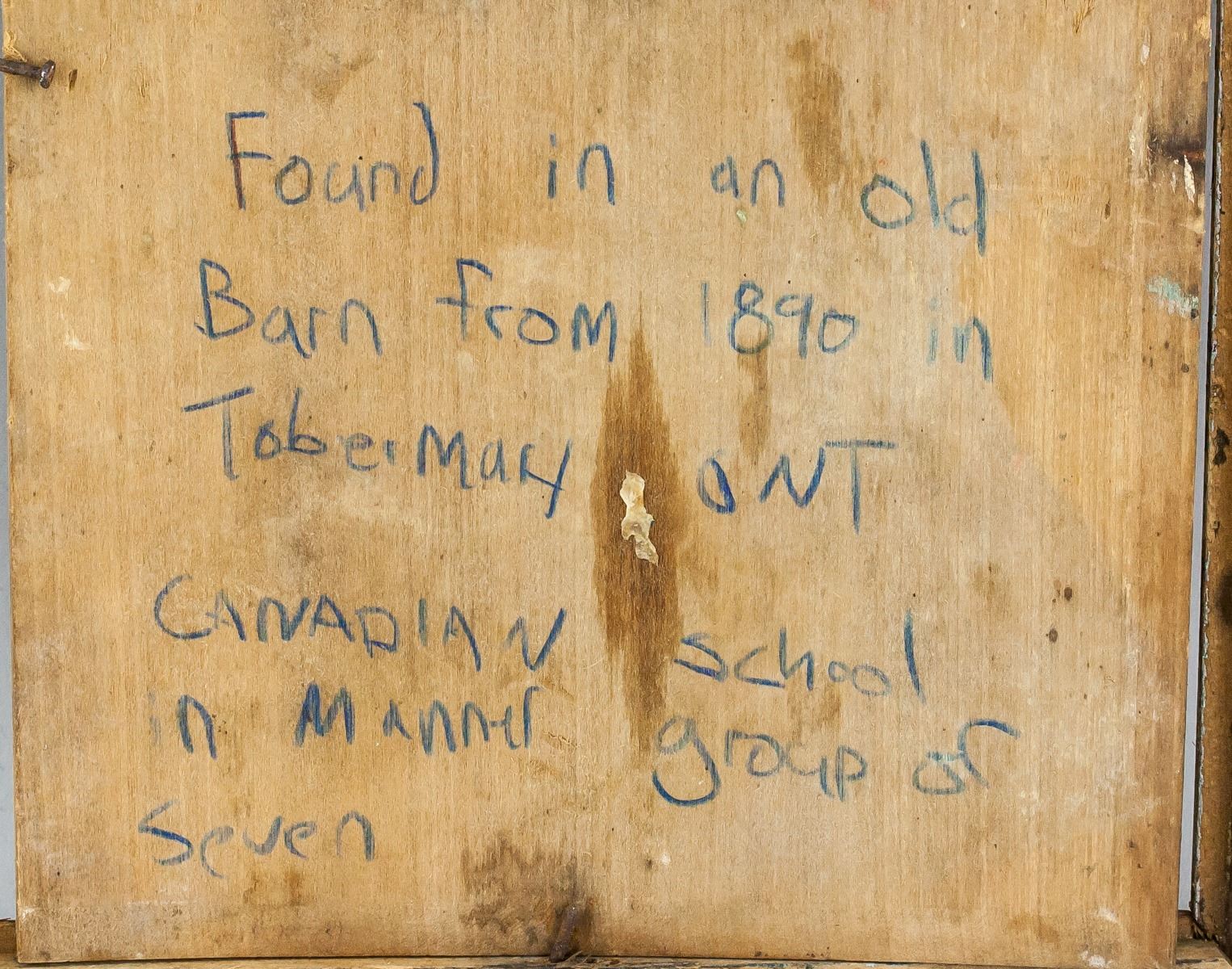 Oil on board, framed. Featuring country landscape scene. Signed Tom Stone in bottom left corner. Inscribed on verso "Tom Albert Stone (1896-1978) OSA" and "Found in an old barm from 1890 in Tobermary ONT Canadian School in Manner group of Seven".