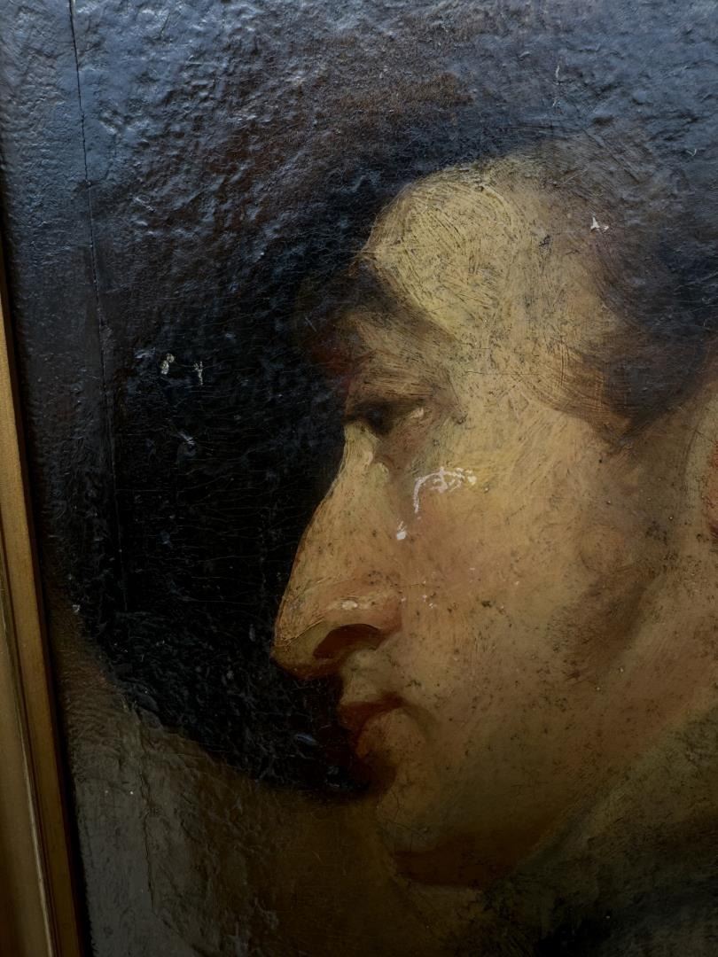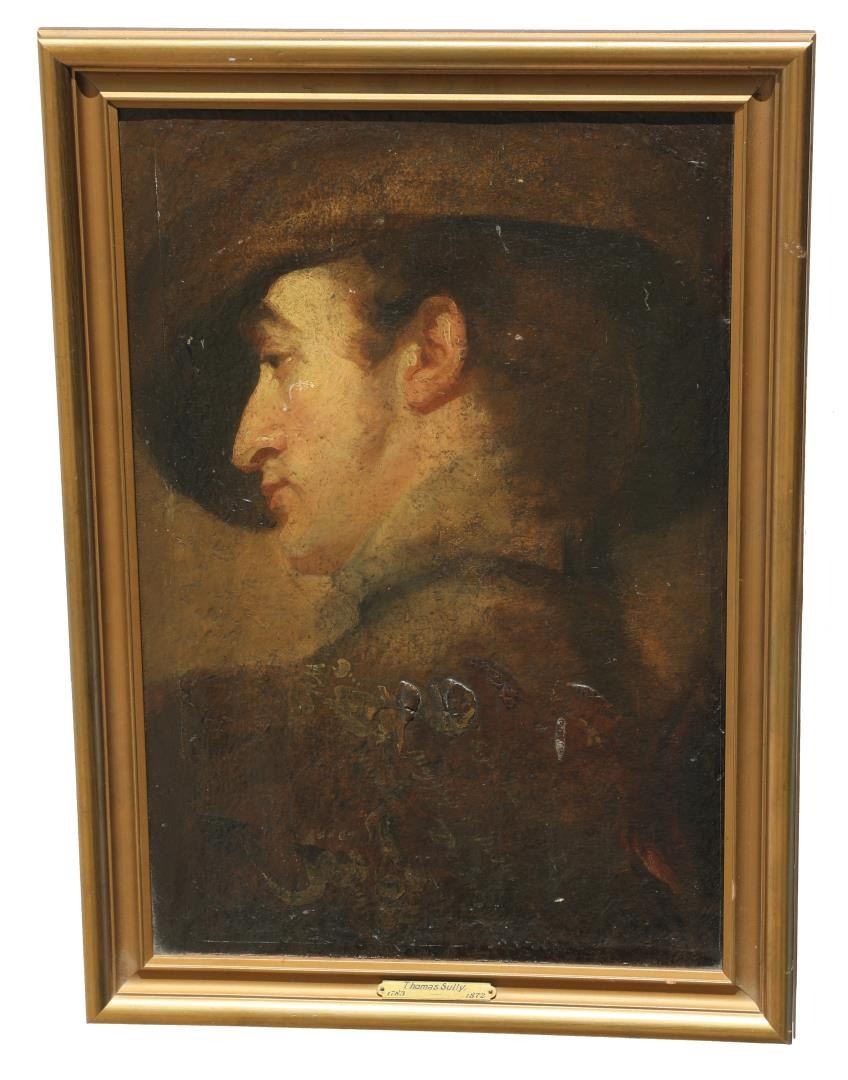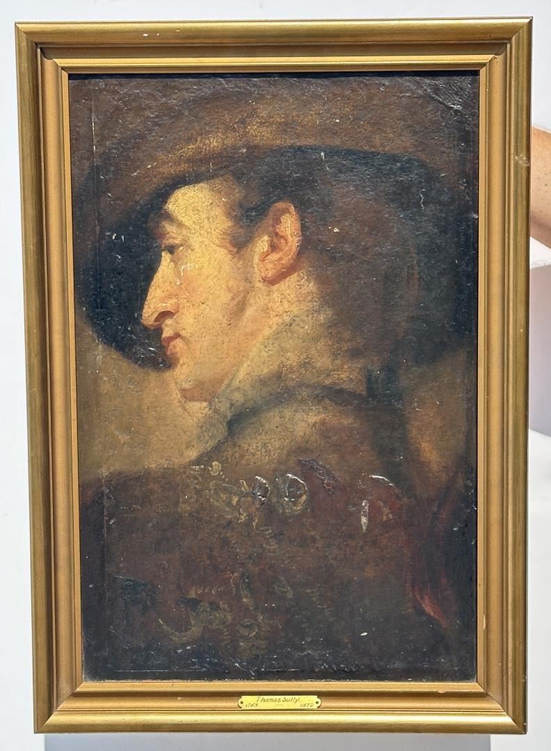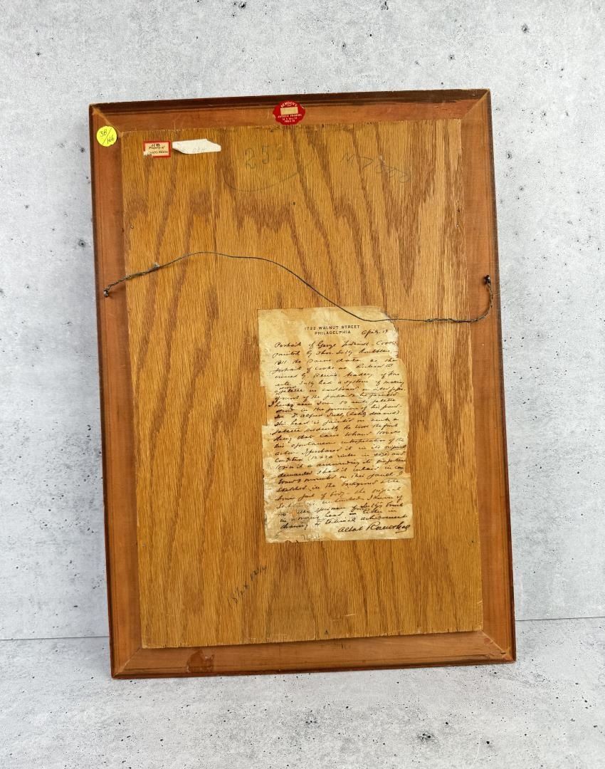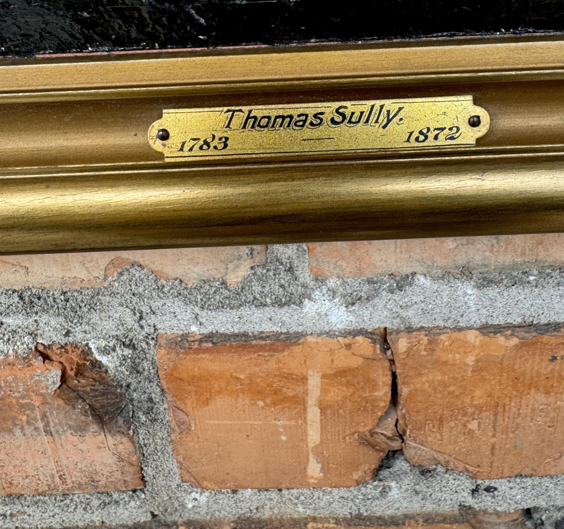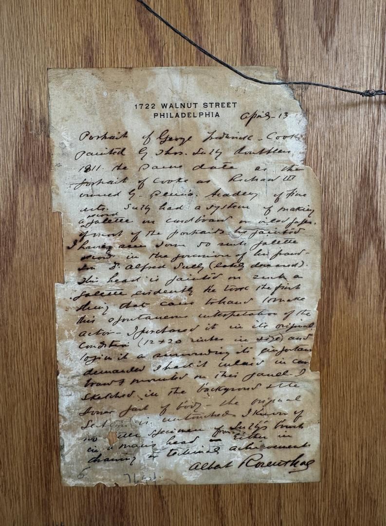 Title is Portrait of George Frederick Cooke as Richard III. Oil on Canvas. Original frame with documentation on the back, written by fellow Portrait Artist and Collector Albert Rosenthal. Letter states that the portrait was originally acquired by the Pennsylvania Academy of the Fine Arts from the artist. The note also states that the painting was made during George Frederick Cooke's American tour prior to his death in 1812. The other portrait of George Frederick Cooke which is still retained by the Pennsylvania Academy of Fine Arts is considered to be Thomas Sully's masterpiece. 14 7/8" by 21 1/8" framed. Portrait could benefit from cleaning, and is currently in original, untouched condition. Thomas Sully (1783 - 1872) was active/lived in Pennsylvania / England. Thomas Sully is known for Portrait, historical, and landscape painting. A teacher at the Pennsylvania Academy of the Fine Arts, Thomas Sully became one of the foremost early 19th-century portrait painters, known for painting pretty faces on his subjects, often disregarding reality. He was the son of English actors and was born in Horncastle, Lincolnshire. He came to Philadelphia in 1792 when he was nine years old. Sully showed early drawing talent and first studied with his older brother, Lawrence, a miniature painter. To earn money, he tried unsuccessfully to have a career in insurance but then turned full time to painting and was able to be critiqued by Gilbert Stuart in Boston. He embraced Stuart's interest in classical styles, but favored pretty colors and opaque and glossy surfaces. Like Stuart, his subjects appear heroic and seem to have a sense of purpose. In 1801, he moved with Lawrence's family to Virginia, but Lawrence died, so Thomas cared for the family and married the widow two years later. In 1808, accepting an attractive offer from a patron, he moved to Philadelphia for the remainder of his life excepting the new two years when a syndicate of patrons sent him to England to paint and study. He returned with a copy of an Old Master painting for each patron. His twenty-three year old daughter, Blanch, accompanied him to England where he did a portrait of Queen Victoria, a commission filled from a request through the Philadelphia chapter of the Society of the Sons of Saint George. Blanch substituted for the Queen in many of the sittings, and even wore the British crown, the only American ever to have this distinction. She also modeled in Victoria's state robes. The Queen was extremely pleased with the portrait, which was finished in Philadelphia. In Philadelphia, Sully shared a studio with Charles Bird King, portrait painter, and taught at the Academy.
