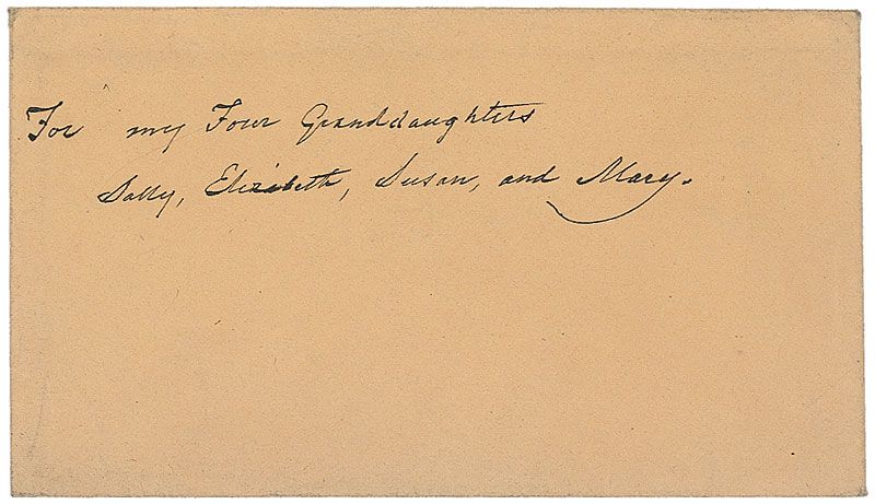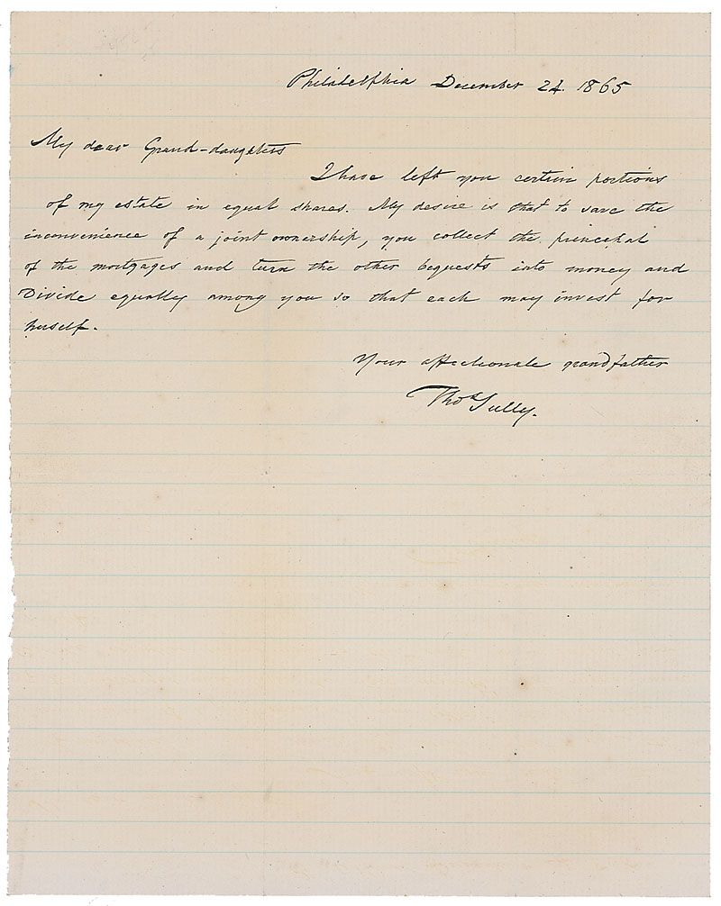 British-born American painter of portraits and historical scenes (1783–1872) such as Washington's Passage of the Delaware. ALS signed “Thos Sully,” one page, lightly-lined, 7.75 x 9.75, December 24, 1865. Letter to his four granddaughters. In full: “I have left you certain portions of my estate in equal shares. My desire is that to save the inconvenience of a joint ownership, you collect the principal of the mortgages and turn the other bequests into money and divide equally among you so that each may invest for herself.” In fine condition, with intersecting folds, one through a single letter of signature. Accompanied by the original transmittal envelope on which Sully has written, “For my Four Granddaughters / Sally, Elizabeth, Susan, and Mary.” Sully had completed his will just six days earlier.