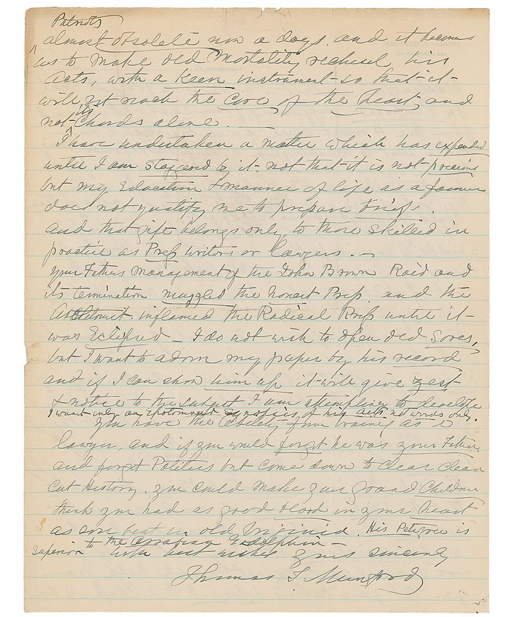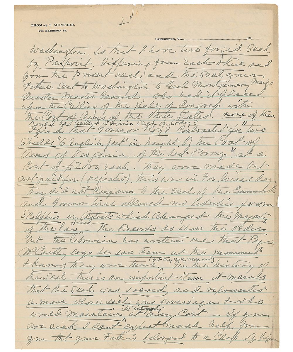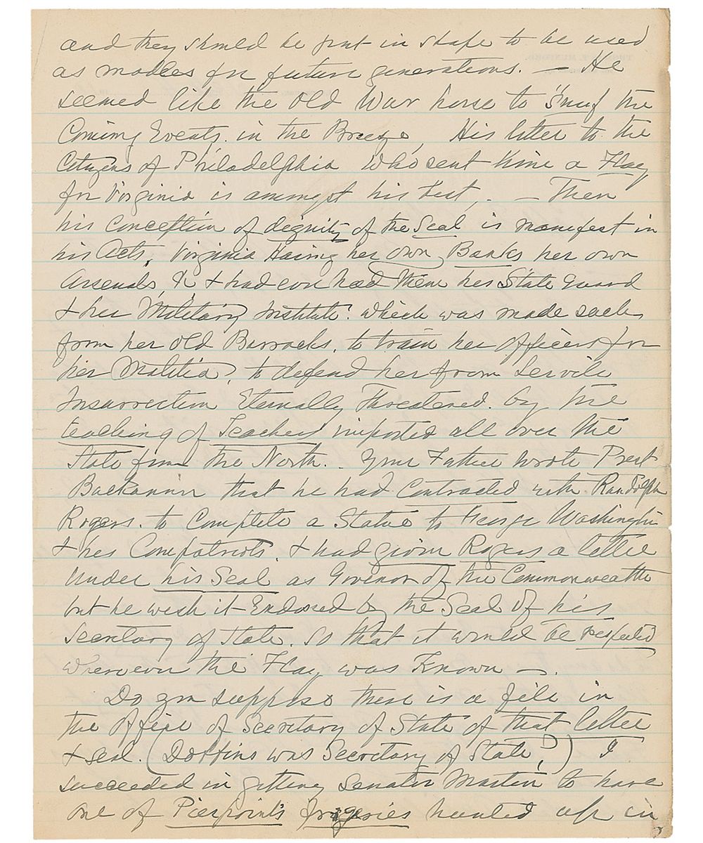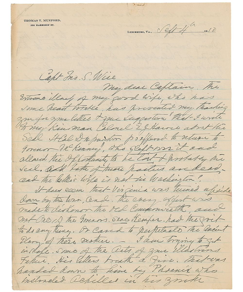 ALS, two pages, lightly-lined both sides, 8.25 x 10.75, personal letterhead, September 4, 1910. Letter to Captain John S. Wise. In part: “It does seem that Virginia was turned upside down by the war, and that every effort was made to dishonor the old commonwealth…the governor…his conception of the dignity of the seal is manifest in his acts, Virginia having her own banks, her own arsenals…I have two forged seals by Pierpoint differing from each other and from the present seal and the seal your father sent to Washington to Genl Montgomery Meigs…who had it placed upon the ceiling of the Hall of Congress with the Coat of Arms of the other states…they did not confirm the seal of the Commonwealth and Governor Wise allowed no liberties…Your father’s management of the John Brown Raid and its termination muzzled the honest press…I do not wish to open old sores…and if you would forget he was your father and forget politics but come down to clear clean cut history, you could make your grandchildren think you had as good blood in your heart.” Small tears and toning to edges, otherwise fine condition.