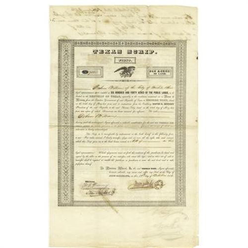 <B>Thomas Toby </B></I><B><I>"Texas Scrip"</B></I></B></I><B> Land Grant</B></I>. Four pages, 17" x 10.5", New Orleans, October 10, 1836. This partially printed document grants to <I>"Dobson Williams of the City of Mobile"</B></I> through his agent, Thomas Toby, 640 acres of land in the Republic of Texas according to the instructions of President David G. Burnet. Page two includes a handwritten acknowledgment of the legal transfer of <I>"the rights, title and interest"</B></I> of the land. Page three includes the commission of Thomas Toby as the lawful agent, approved by the Executive Department of the Republic of Texas, Velasco, May 25, 1836, and signed by David G. Burnet and William Christy. Very good condition with folds, tiny holes along the folds and nicks on the edges. <I>From the collection of Darrell Brown</B></I>.<BR><BR><b>Shipping:</b> Flat Material, Small (<a target="_blank" href="http://www.heritageauctions.com/common/shipping.php">view shipping information</a>)