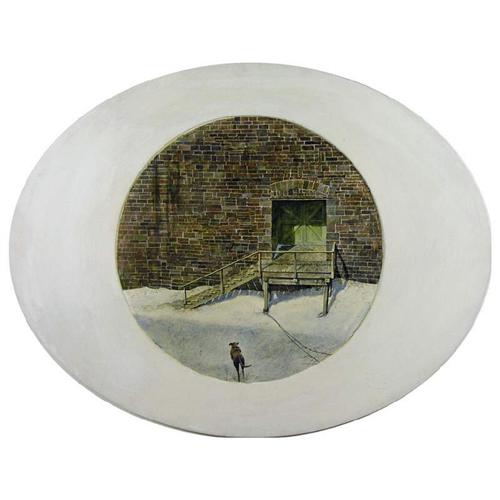 [Canadian b. 1936] THE DOG LOOSE; 1973 Egg tempera on board 22.5 x 28.25 in. (oval) Signed, titled & dated.