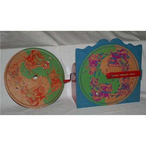 Thomas Toy Hurdy Gurdy - Plastic player & 3 caradboard discs. Player marked Thomas Toy Newark. Measures approx. 8 ½" x 8" x 4 ½" . 8" discs marked made in England. In Played with condition.