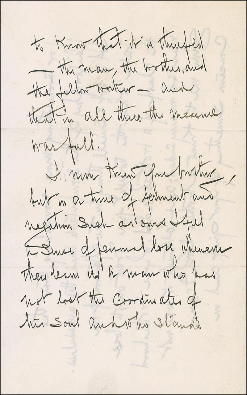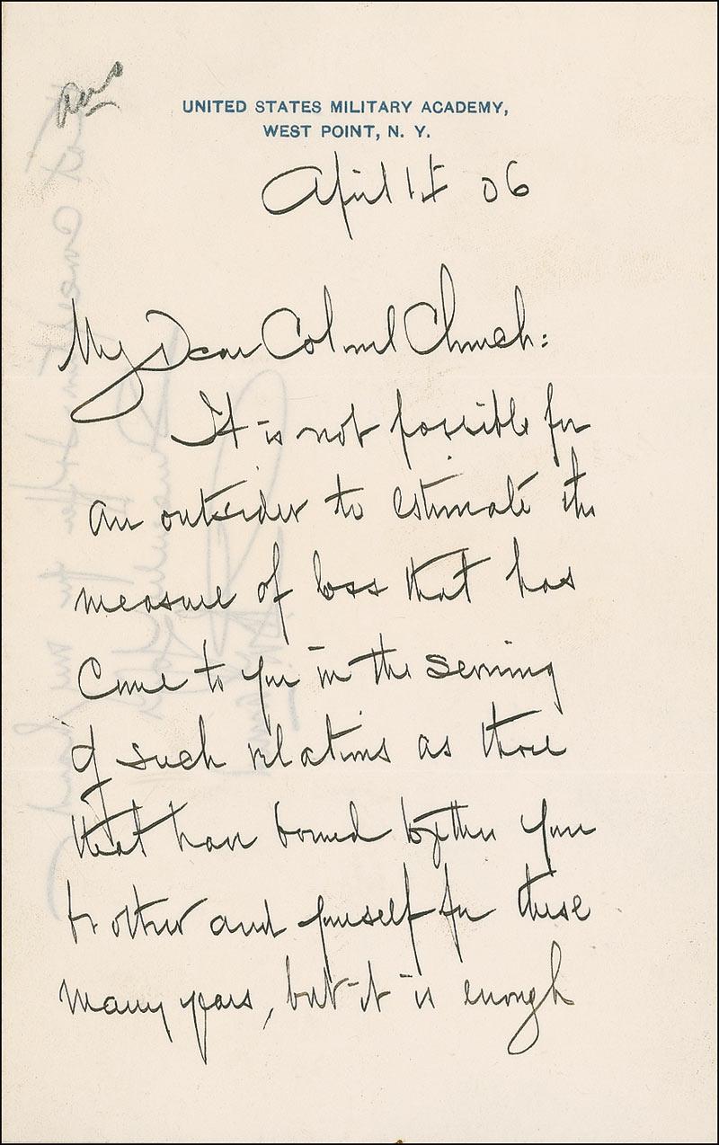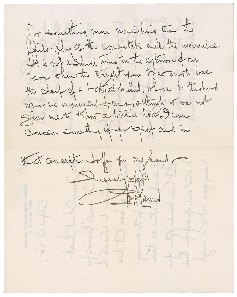 American banker (1870-1948) and partner of J. P. Morgan. ALS signed “T. W. Lamont,” four pages on two adjoining sheets, 5 x 8, United States Military Academy letterhead, April 12, 1906. Letter to Colonel Church sending condolences. In part: “It is not possible for an outsider to estimate the measure of loss that has come to you in the severing of such relations as those that bound together your brother and yourself for these many years, but it is enough to know that it is threefold—the man, the brother, and the fellow worker—and that in all three the measure was full.” In fine condition, with a vertical mailing fold through last letter of signature.