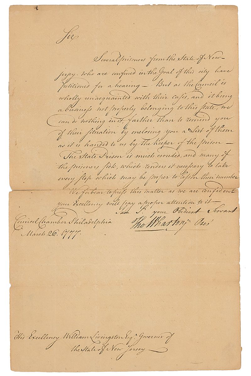 Pennsylvania merchant and politician (1735–1778) who served as the first president of Pennsylvania. Revolutionary War–dated LS signed “Tho. Wharton, Jr., Pres,” penned in the hand of Timothy Matlack, one page, 8 x 12.5, Philadelphia, March 26, 1777. Letter to William Livingston, governor of New Jersey. In full: “Several prisoners from the State of New-jersey who are confined in the Goal [sic] of this city have petitioned for a hearing—But as the Council is wholly unacquainted with their cases, and it being a business not properly belonging to this state, we can do nothing in it, farther than to remind you of their situation by enclosing you a List of them as it is handed to us by the Keeper of the Prison—The State Prison is much crowded, and many of the prisoners sick, which renders it necessary to take every step which may be proper to lessen their number.” Intersecting folds with complete separation to central horizontal fold (repaired with archival tape on the reverse), and a few small edge chips and tears, otherwise very good condition; the integral address leaf, also repaired, is detached but present. The conditions of Philadelphia’s jails continued to descend into squalor over the course of a decade, prompting some of the city’s most prominent figures—Ben Franklin and Dr. Benjamin Rush among them—to form The Philadelphia Society for Alleviating the Miseries of Public Prisons in 1787, advocating for reform of harsh conditions and punishments for inmates. Philadelphia became the worldwide center of prison reform, with others adopting similar policies after observing their success. A letter with great associations between founding fathers—Wharton as Pennsylvania’s governor, Livingston as a signer of the Constitution, and Matlack as the engrosser of the Declaration of Independence—with important sociological content.