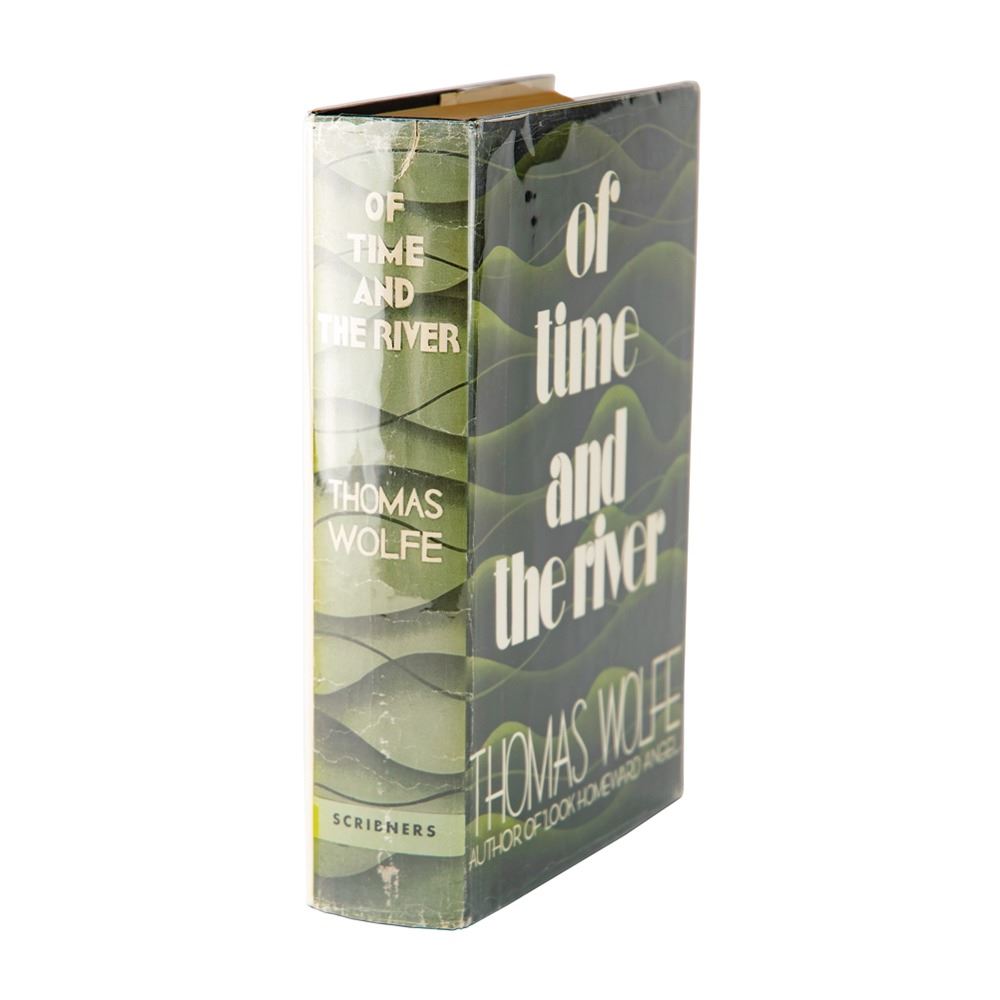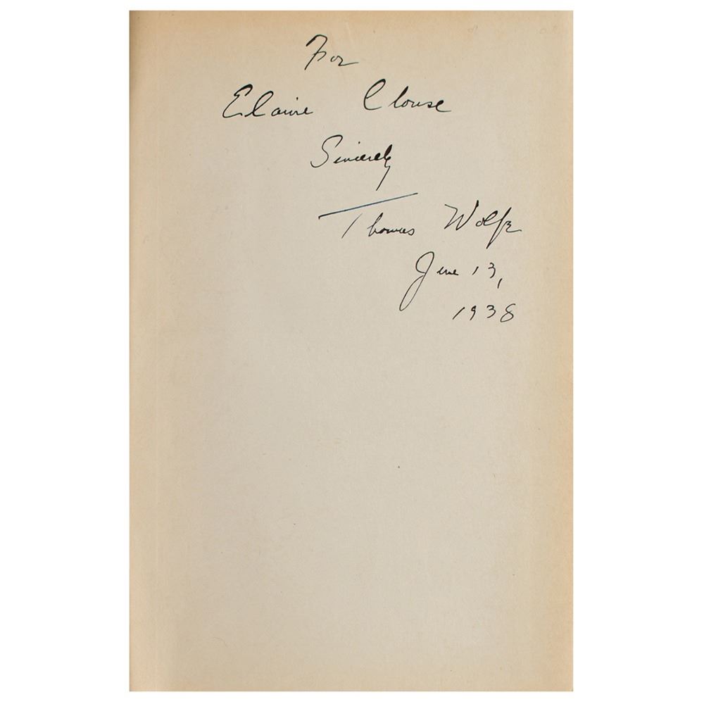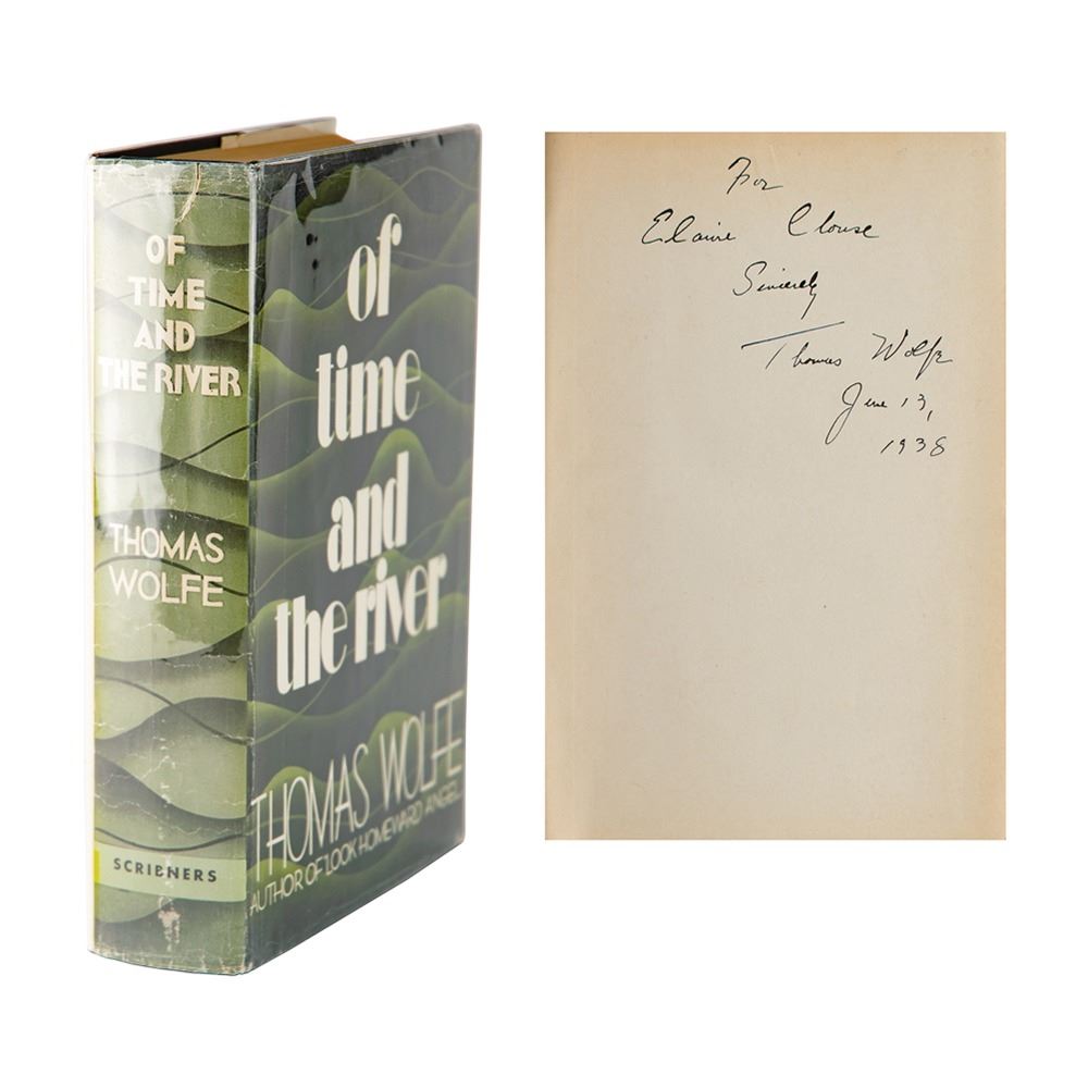 Signed book: Of Time and the River. Fifth printing. NY: Charles Scribner's Sons, 1935. Hardcover with dust jacket, 6 x 8.5, 912 pages. Signed and inscribed on the front free end page, "For Elaine Clouse, Sincerely, Thomas Wolfe, June 13, 1938." Autographic condition: fine, with some professional restoration present (to remove ink blotting) but all writing original. Book condition: VG/VG, with a touch of edge wear and a few small tears to jacket, loose front hinge, and subtle, even toning to interior. The consignor notes that Clouse was a Portland schoolteacher and avid admirer of Wolfe. The writer had departed New York City in late May 1938, arriving in Portland on June 7th and beginning an auto tour of national parks on June 20th. He passed away on September 15th.