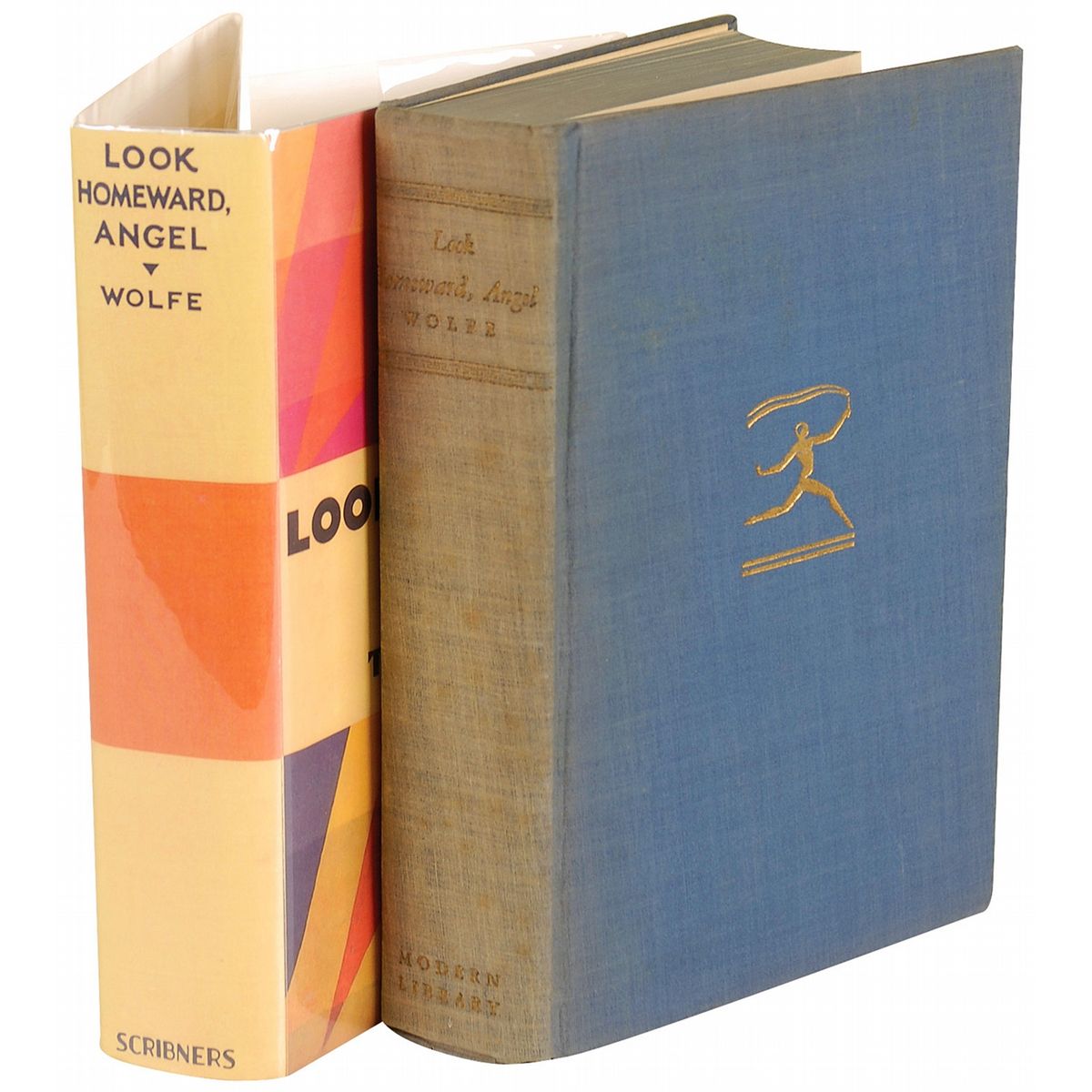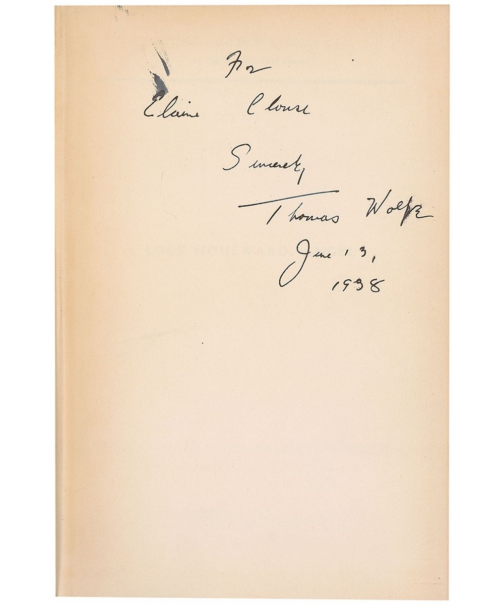 Highly regarded American writer (1900–1938) whose four novels, including Look Homeward, Angel and Of Time and the River, take a place among the high points of twentieth-century fiction. Signed book: Look Homeward Angel. NY: Modern Library, 1929. Hardcover with reproduction dustjacket, 5.75 x 8.25, 626 pages. Signed and inscribed on the first free-end page “For Elaine Clouse, Sincerely, Thomas Wolfe, June 13, 1938.” In fine condition, with a small brush to a single letter of inscription and signature. Wolfe had left New York City in late May of 1938, arriving in Portland on June 7 and beginning an auto tour of national parks on June 20th. He would pass away on September 15, 1938. Consignor notes Clouse was a Portland school teacher and an avid admirer of Wolfe.