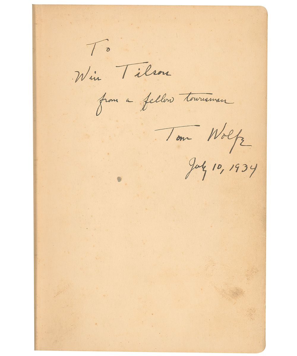Signed book: Look Homeward Angel. First edition. NY: Charles Scribner's Sons, 1931. Hardcover, 5.25 x 7.75, 626 pages. Signed and inscribed on the first free end page, “To Win Tilson from a fellow townsman, Tom Wolfe, July 10, 1934.” Autographic condition: scattered toning and soiling, not detracting from the bold signature and inscription, otherwise fine. Book condition: VG-/None. Navy cloth-covered boards; edges worn, with tears in cloth at corners and spine-ends; gilt titles have completely disappeared; insect damage along spine; moderately shaken; textblock yellowed, with some light foxing (mostly at first/last few pages); previous owner’s bookplate to front pastedown. Tilson and Wolfe were both from Asheville, North Carolina, fictionalized in the novel as Altamont, Catawba.