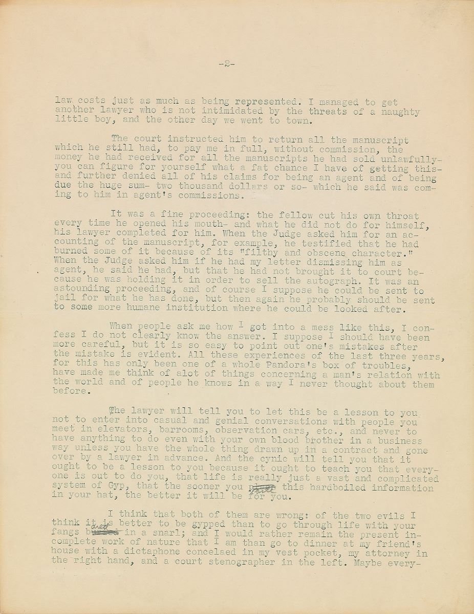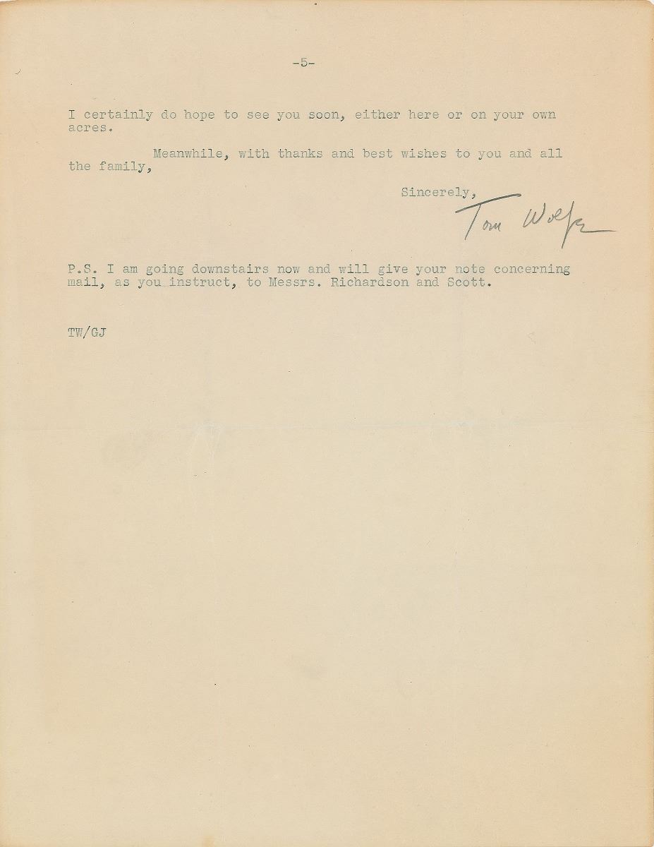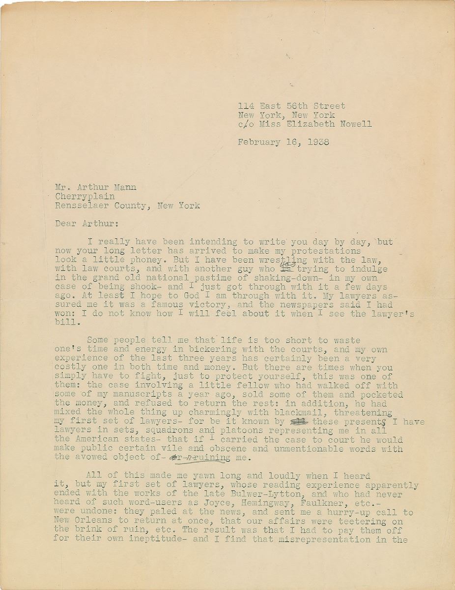Influential American writer (1900–1938) known for his poetic autobiographical fiction, best remembered for the 1929 novel Look Homeward, Angel. TLS signed in pencil, “Tom Wolfe,” five pages, 8.5 x 11, February 16, 1938. Letter to sportswriter Arthur Mann. In part: “I have been wrestling with the law, with law courts, and with another guy who was trying to indulge in the grand old national pastime of shaking-down…At least I hope to God I am through with it. My lawyers assure me it was a famous victory, and the newspapers said I had won: I do not know how I will feel about it when I see the lawyer’s bill. Some people tell me that life is too short to waste one’s time and energy in bickering with the courts…But there are times when you simply have to fight, just to protect yourself, this was one of them: the case involving a little fellow who has walked off with some of my manuscripts a year ago, sold some of them and pocketed the money, and refused to return the rest: in addition, he had mixed the whole thing up charmingly with blackmail, threatening my first set of lawyers…My first set of lawyers, whose reading experience apparently ended with the works of the late Bulwer-Lytton, and who had never heard of such word-users as Joyce, Hemingway, Faulkner, etc.—were undone…The result was that I had to pay them off for their own ineptitude…I managed to get another lawyer who is not intimidated by the threats of a naughty little boy, and the other day we went to town…