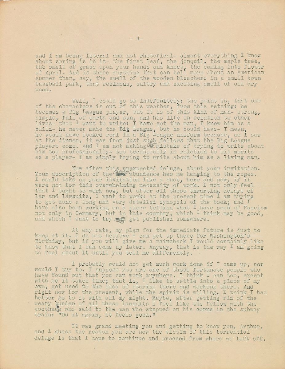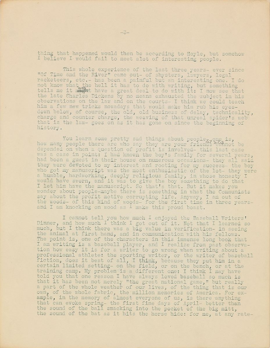 I cannot tell you how much I enjoyed the Baseball Writers’ Dinner, and how much I think I got out of it. Not that I learned so much, but I think there was a big value in verification—in seeing the animal at first hand, and in communication with his fellows. The point is, one of the characters in this immense long book that I am writing is a baseball player, and I realize from past observations how easy it is for a writer to go wrong when writing about a professional athlete…I think I may have told you that one reason I have always loved baseball so much is that it has been not merely ‘the great national game,’ but really a part of the whole fabric, the million memories of America. For example, in the memory of almost everyone of us, is there anything that can evoke spring—the first fine days of April—better than the sound of the ball smacking into the pocket of the big mitt, the sound of the bat as it hits the horse hide: for me, at any rate—and I am being literal and not rhetorical—almost everything I know about spring is in it…And is there anything that can tell you more about an American summer than, say, the smell of the wooden bleachers in a small town baseball park, that resinous, sultry and exciting smell of old dry wood.” Wolfe makes several small revisions in pencil throughout the text. In fine condition.