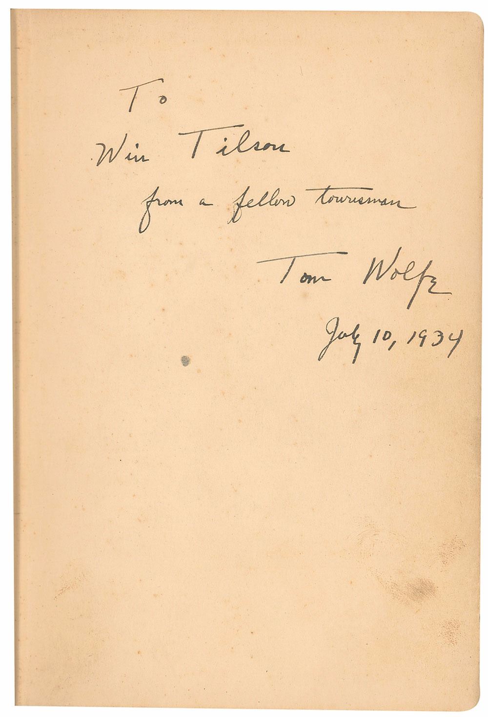 Signed book: Look Homeward Angel. Later printing. NY: Charles Scribner's Sons, 1931. Hardcover, 5.25 x 7.75, 626 pages. Signed and inscribed on the first free end page, "To Win Tilson from a fellow townsman, Tom Wolfe, July 10, 1934." Autographic condition: scattered toning and soiling, not detracting from the bold signature and inscription, otherwise fine. Book condition: VG-/None. Tilson and Wolfe were both from Asheville, North Carolina, fictionalized in the novel as Altamont, Catawba.