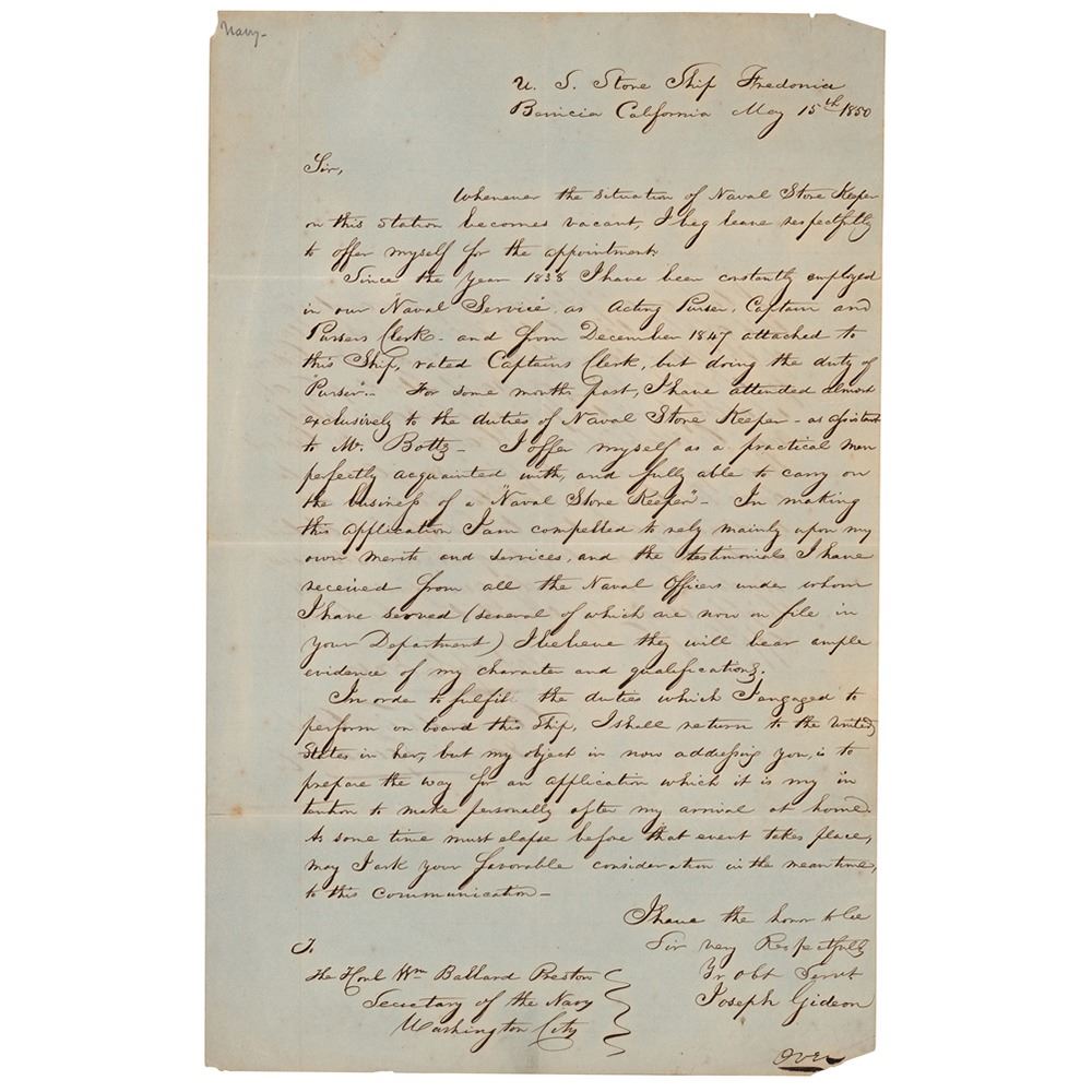 Naval officer during the War of 1812 who later seized the port of Monterey during the Mexican-American War (1790–1858); he was the model for Herman Melville's model 'Commodore J—' in Moby-Dick, and the 'Commodore' in White-Jacket. LS signed “Tho. ap C. Jones,†one page, 7.75 x 12.5, May 15, 1850. Jones forwards a letter from Joseph Gideon, who requests an appointment as Naval Store Keeper. Jones's statement, in part: "I take great pleasure in forwarding this application to the Honorable Secretary of the Navy, earnestly recommending Mr. Gideon for the appointment of Naval Storekeeper at whatever point the principal Naval Station may be established in California." In very good to fine condition, with show-through from wrigin on opposing sides, a rusty circular paperclip impression to the top, and partial separation to the hinge.
