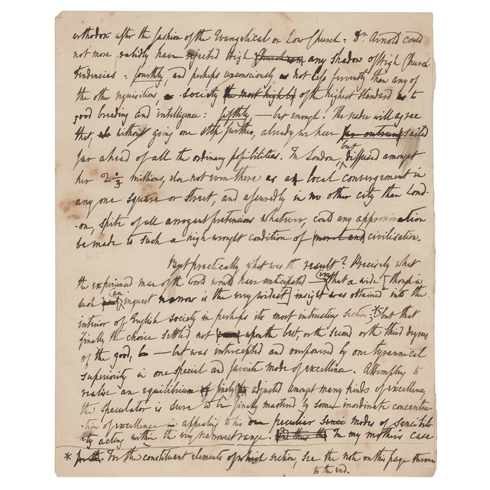 Scarce partial handwritten manuscript by Thomas de Qiuncey, unsigned, one page, 7.25 x 9, no date. Leaf from the manuscript from an apparently unpublished story or essay, in part: "orthodox after the fashion of the Evangelical or Low Church. Dr. Arnold could not more rabidly have rejected‰Û_any shadow of High Church tendencies. Fourthly, and perhaps unconsciously not less fervently than any of the other requisitions, Society of the highest standard as to good breeding and intelligence. Fifthly‰ÛÓbut enough!‰Û_In London, but diffused amongst her 2 1/3 millions, else not soon there as at local convergement in any one square or street, and assuredly in no other city than London, spite of all arrogant pretensions whatever, could any approximation be made to such a high wrought condition of civilisation." In fine condition, with scattered small stains.