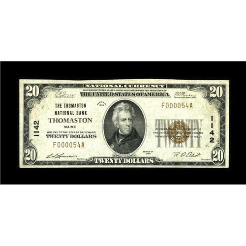 <B>Thomaston, ME</B></I> - $20 1929 Ty. 1 <B>The Thomaston NB</B></I> Ch. # 1142<BR>This <B>Very Fine</B></I> example bears the second of two titles under which this Knox County locale issued. Expect bids to reach about...<BR><BR><b>Shipping:</b> Coin/Currency (<a target="_blank" href="http://www.heritageauctions.com/common/shipping.php">view shipping information</a>)