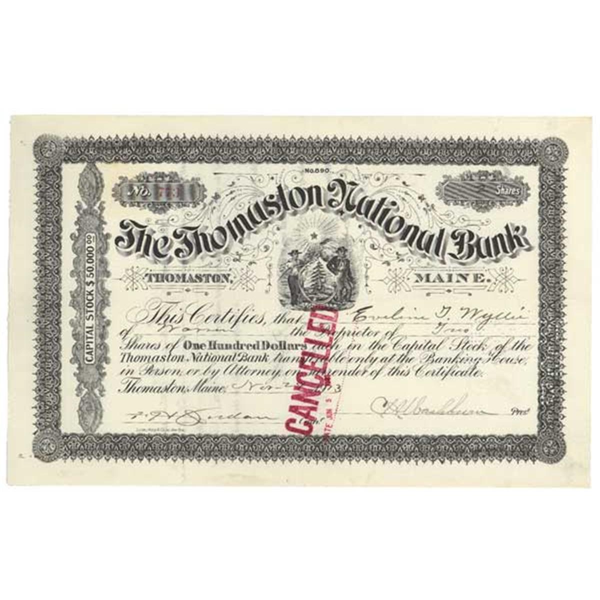 1910, Maine. Stock certificates for 2 shares. Black. Vignette of state seal at top center.