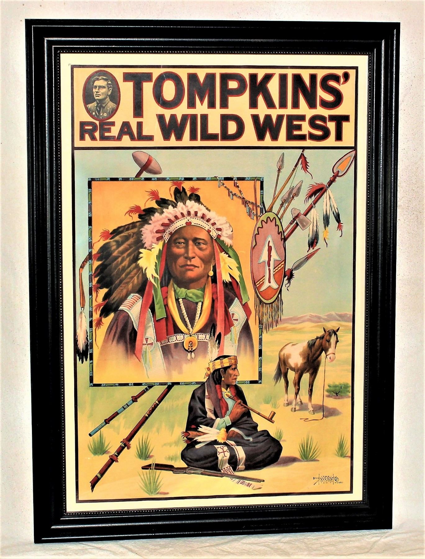 Large original lithograph with pleasing colors showing majestic Indian chief inset, among prairie scene. Professionally framed with poster measuring 28"x 42".