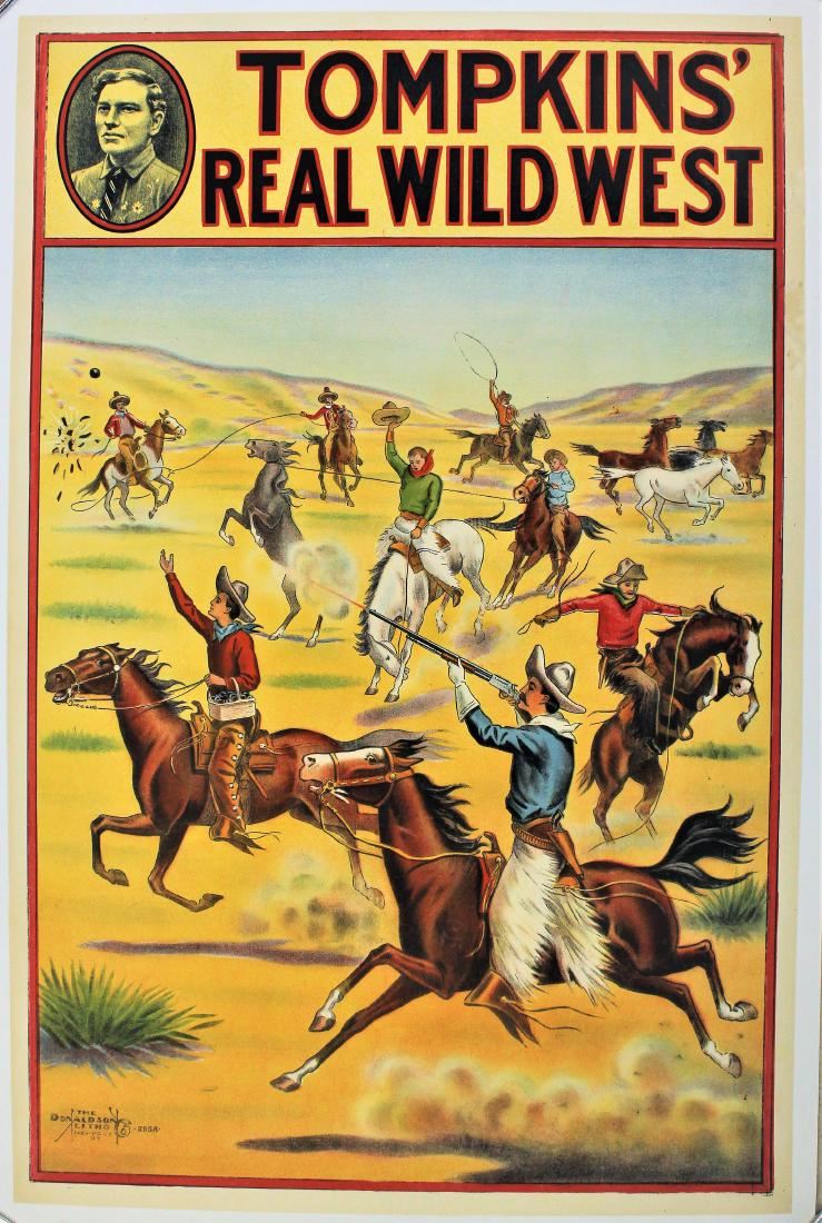Colorful Wild West poster of bucking horses and trick shooters, with vibrant color and in new old stock condition. Measuring 19"x 29".
