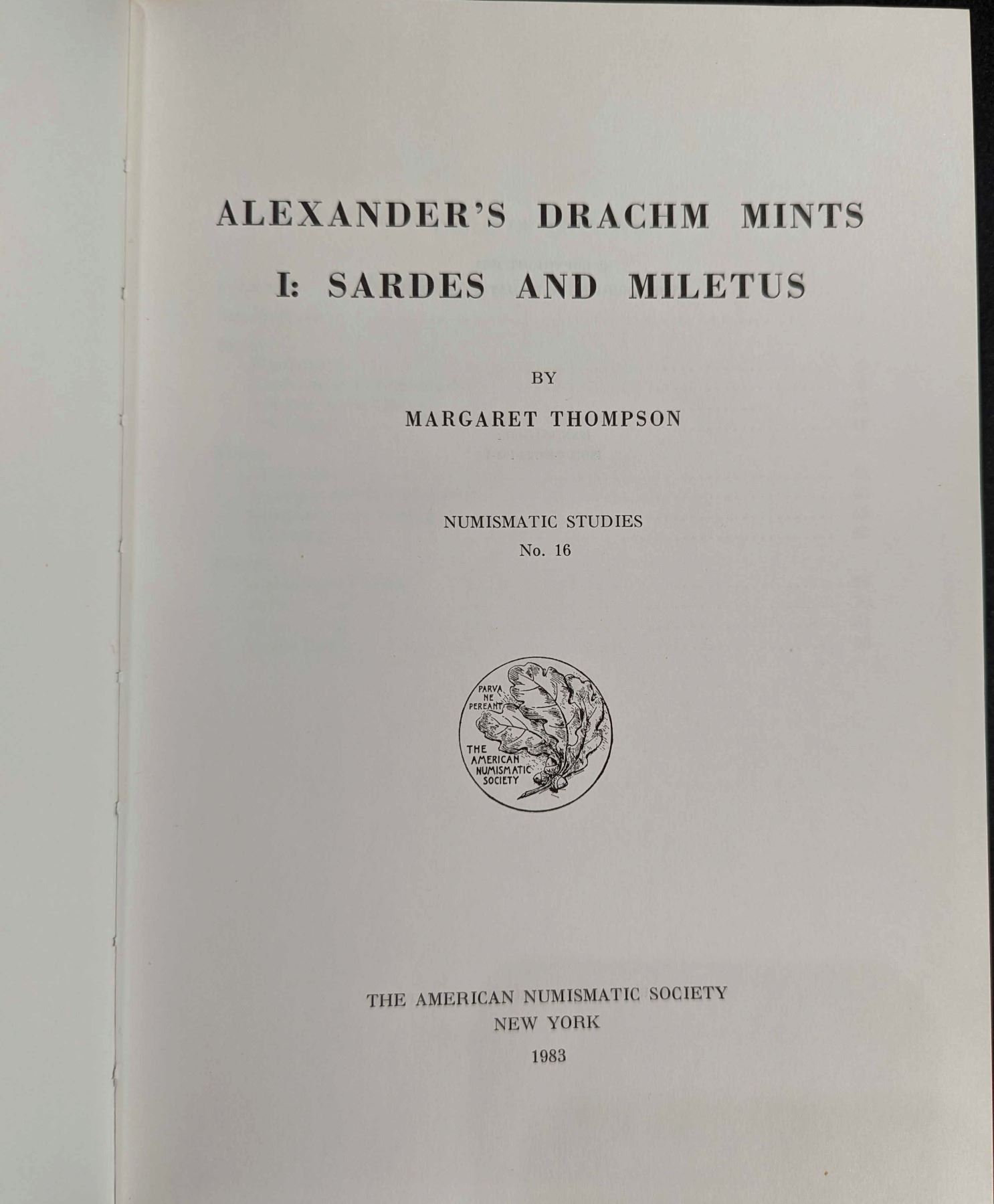 (1) Alexander's Drachm Mints. I - Sardes and Miletus. Thompson, Margaret. 1983. New York. original red cloth, gilt. (6), 98 pages. 38 plates. Fine. Numismatic Studies, No. 16. This book, the first volume on Alexander's drachm mints, gives a detailed account of the coinage produced from about 330-300 B.C. in the cities of Miletus and Sardes in Asia Minor (modern Turkey). The mints of Miletus and Sardes produced primarily coins in drachm denominations that they issued in the tens of thousands. The author's analysis of this coinage is divided into three chapters: one on issues attributed to Sardes, one on issues attributed to Miletus, and one describing sixty-six ancient coin hoards that contain specimens relevant to the chronology of these two mints. Thirty-eight high-quality plates clearly illustrate 800 coins. It is a scholarly work that will be appreciated by Classical numismatists, specialists in ancient history and economics, and students of the history of Alexander's extensive empire.