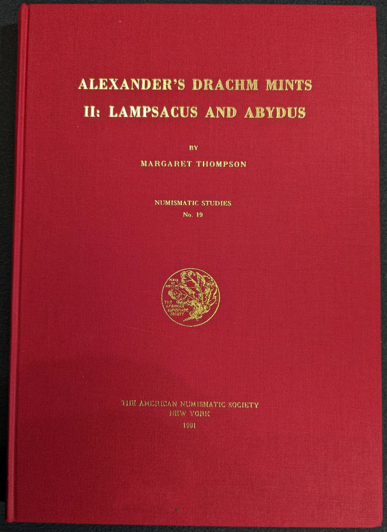(2) Alexander's Drachm Mints. II - Lampsacus and Abydus. Thompson, Margaret. 1991. New York. original red cloth, gilt. 77, (3) pages. 34 plates. Fine. Numismatic Studies, No. 19. This book, the second volume on Alexander's drachm mints, gives a detailed account of the coinage produced from about 330-300 B.C. in the cities of Lampsacus and Abydus in Asia Minor (modern Turkey). The mints of Lampsacus and Abydus produced primarily coins in drachm denominations that they issued in the tens of thousands. The author's analysis of this coinage is divided into three chapters: one on issues attributed to Lampsacus, one on issues attributed to Abydus, and one describing forty-seven ancient coin hoards that contain specimens relevant to the chronology of these two mints. Thirty-four high-quality plates clearly illustrate over 400 coins. It is a scholarly work that will be appreciated by Classical numismatists, specialists in ancient history and economics, and students of the history of Alexander's extensive empire. Lot weight: 2 lbs 15oz. Subject(s): Ancient Coinage.