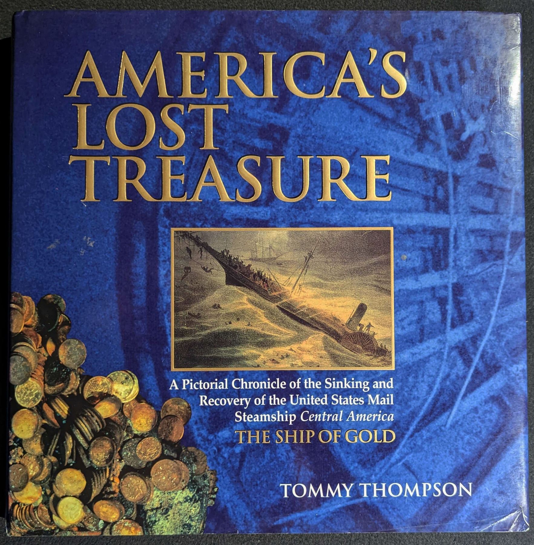 Thompson, Tommy. AMERICA'S LOST TREASURE. A PICTORIAL CHRONICAL OF THE SINKING AND RECOVERY OF THE UNITED STATES MAIL STEAMSHIP CENTRAL AMERICA. The Atlantic Monthly Press/Roundtable Press. 1998. 4to. (2), 191, (3) pages. New York. first edition. original blue cloth, gilt; dust jacket. frontispiece. illustrated. Fine. This book illustrates the magnificent gold coins, bullion, and artifacts recovered from the gold rush steamer, "SS Central America", which sank in 1857 off the coast of North Carolina. This book appears to be a companion to "Ship of Gold in the Deep Blue Sea" (offered in this sale). Lot weight: 3 lbs 4oz. Subject(s): Sunken Treasure.
