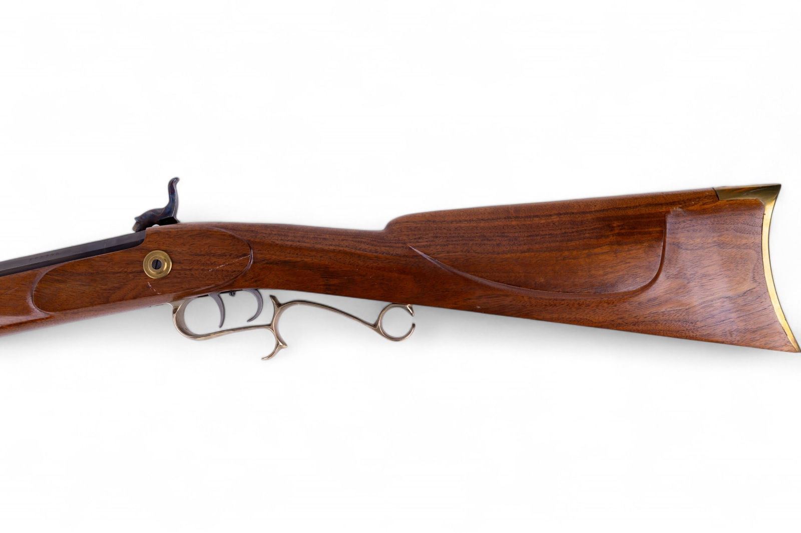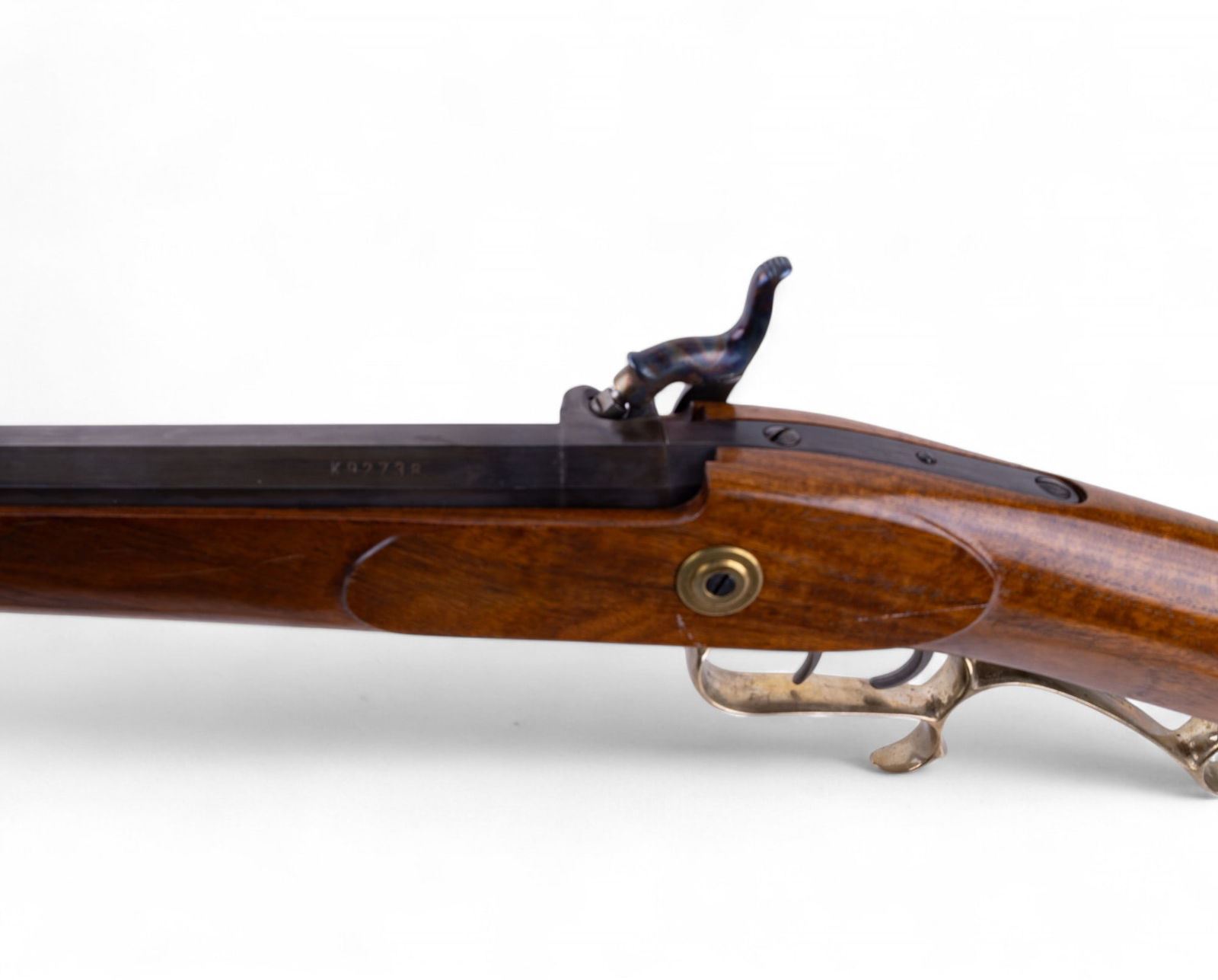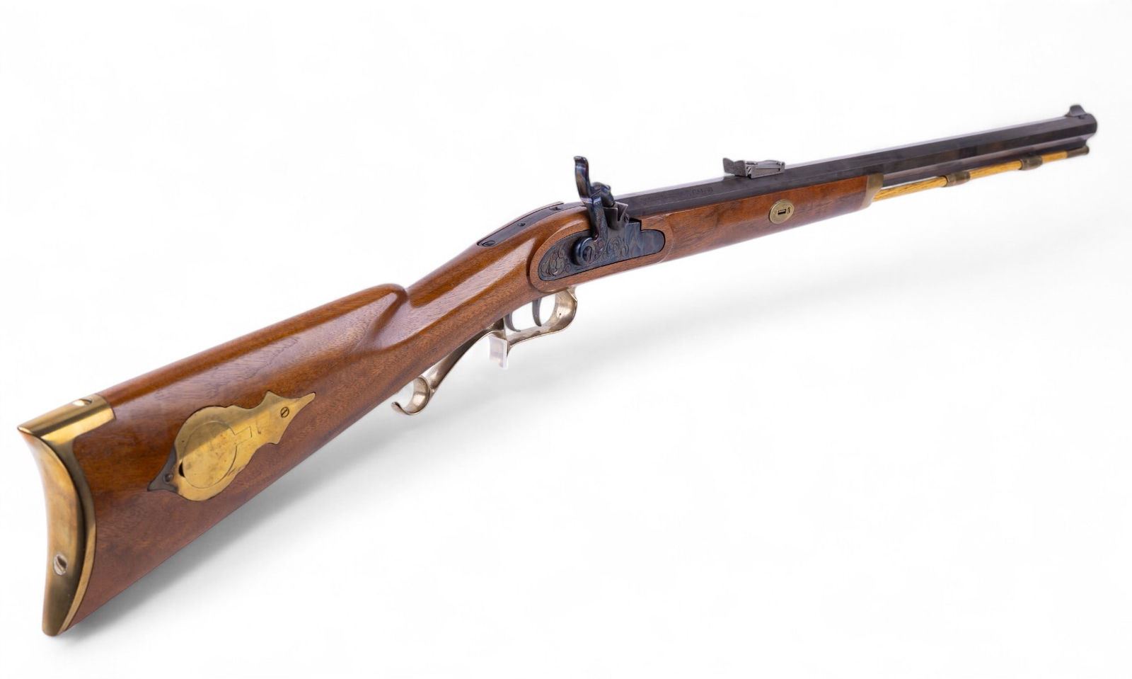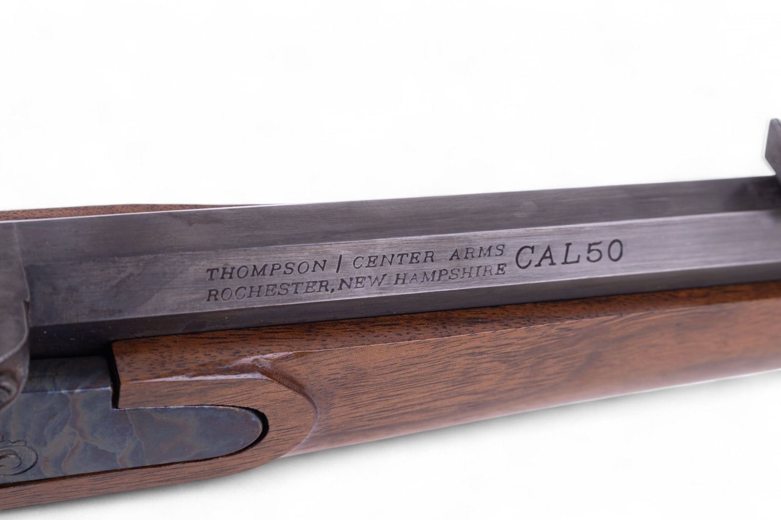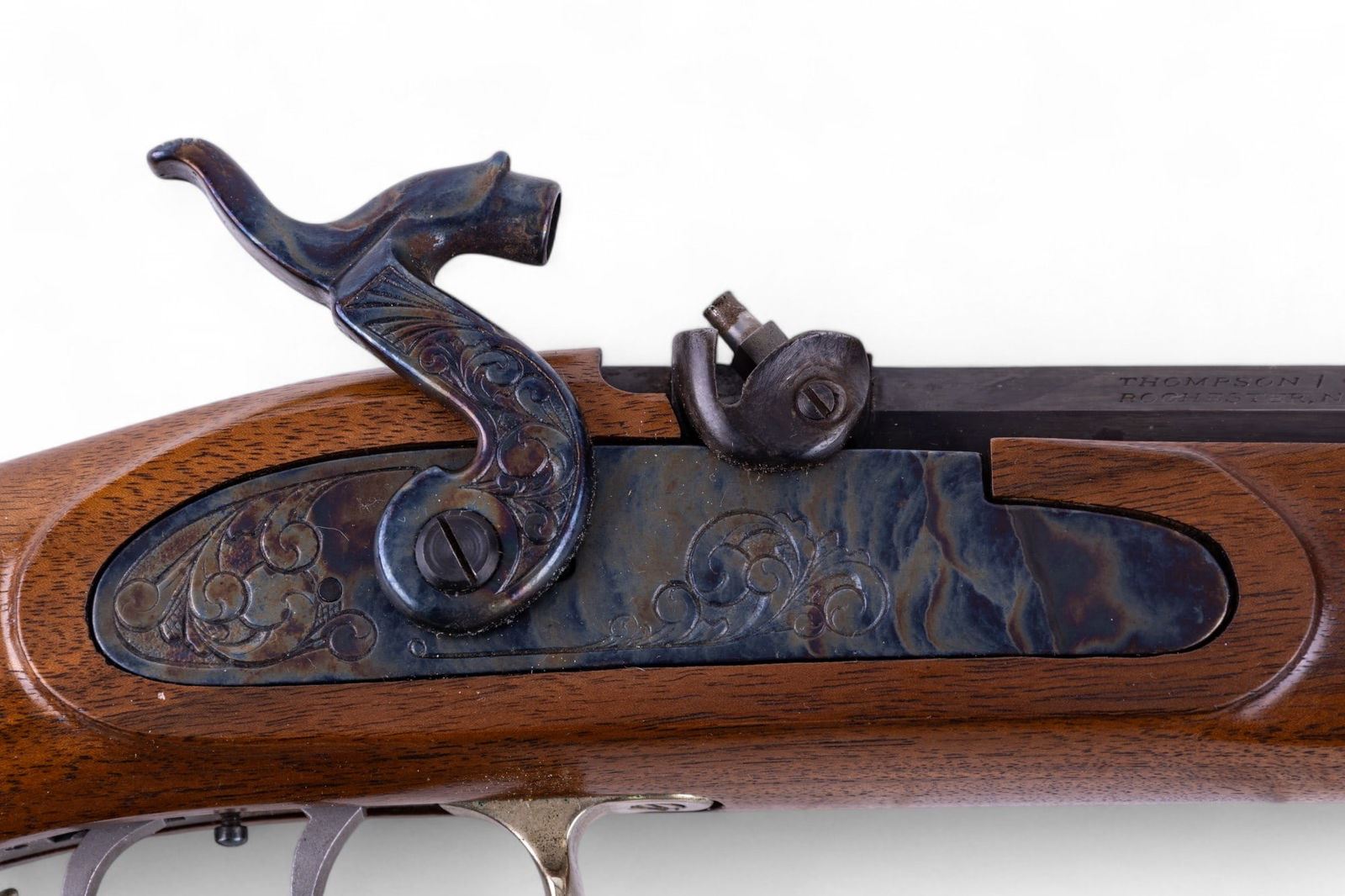 Muzzle loading hunting rifle design and per the booklet, it is "designed after the early 1800's Hawken Brothers rifle. Constructed of steel, American Walnut stock, solid brass trim, double set of triggers, hooked breach system, adjustable hunting sights, and heavy duty coil main spring for lifetime dependability." Brass patch box, percussion cap. 33 page insstruction booklet "Shooting Black Powder Guns / Thompson / Center Arms Company" included along with oils, lubricant, patches, solvent, tape, black powder measure, small tools, and a pouch of round ball bullet moulds. Case approx 48" L x 10.5" W x 4" D.