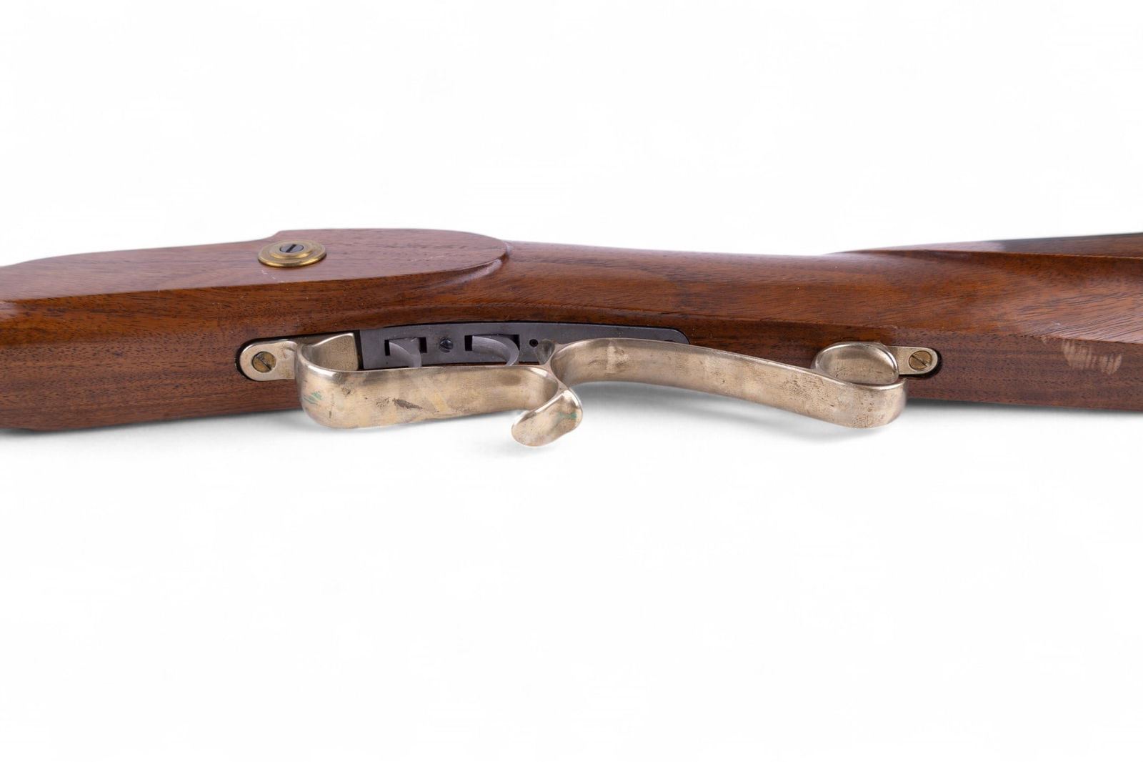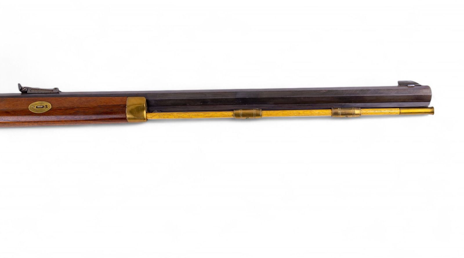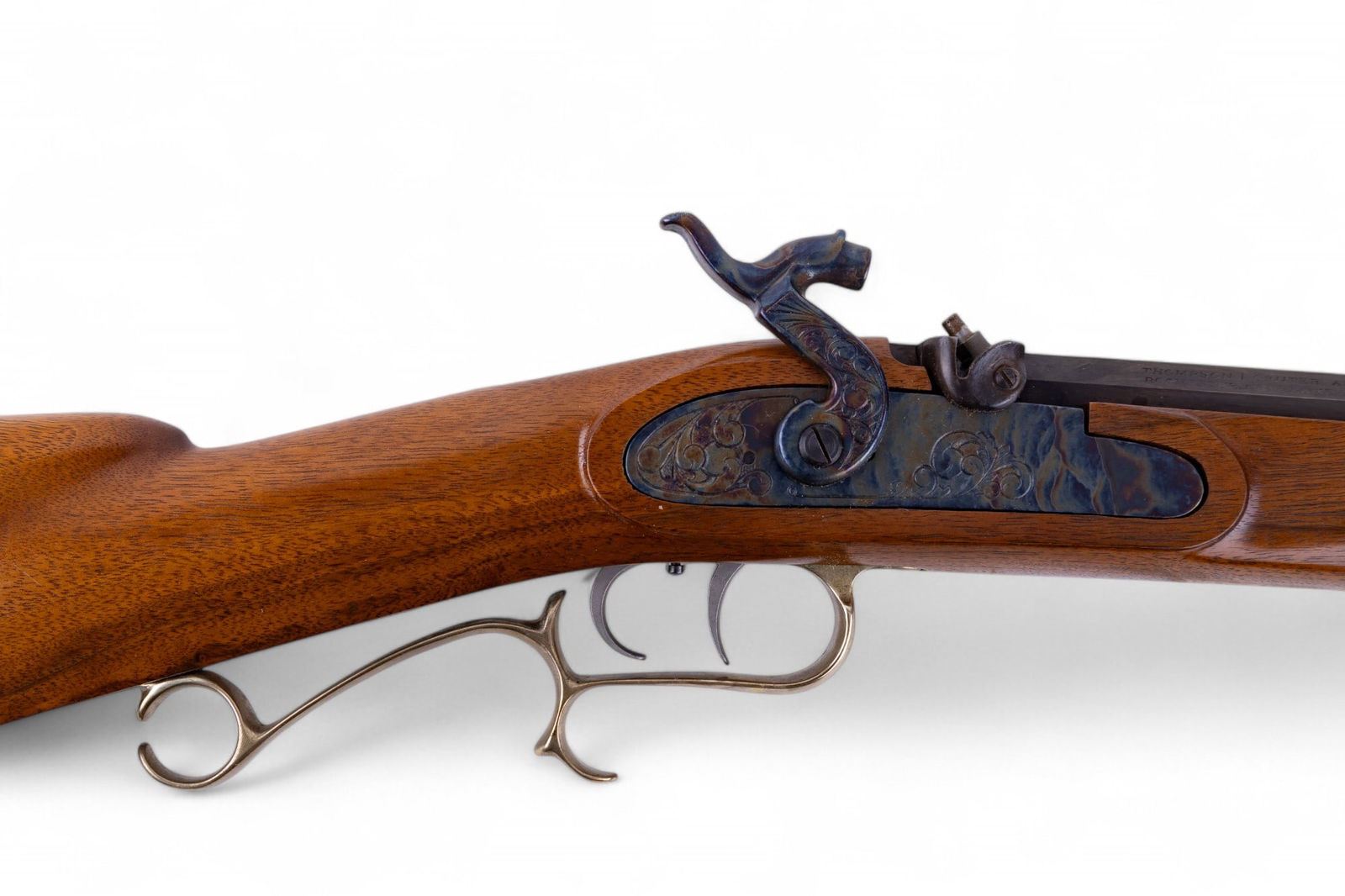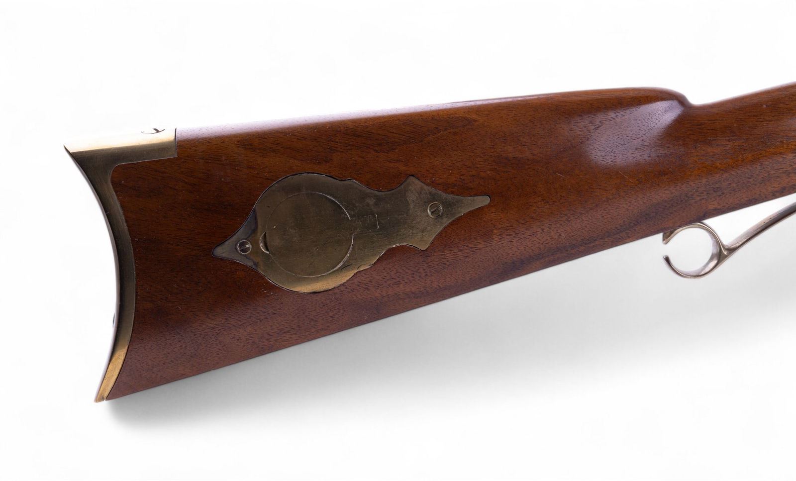 Muzzle loading hunting rifle design and per the booklet, it is "designed after the early 1800's Hawken Brothers rifle. Constructed of steel, American Walnut stock, solid brass trim, double set of triggers, hooked breach system, adjustable hunting sights, and heavy duty coil main spring for lifetime dependability." Brass patch box, percussion cap. 33 page insstruction booklet "Shooting Black Powder Guns / Thompson / Center Arms Company" included along with oils, lubricant, patches, solvent, tape, black powder measure, small tools, and a pouch of round ball bullet moulds. Case approx 48" L x 10.5" W x 4" D.