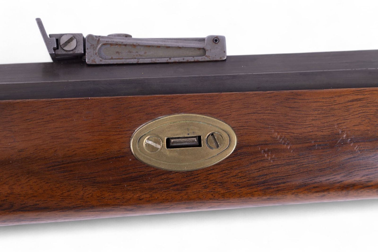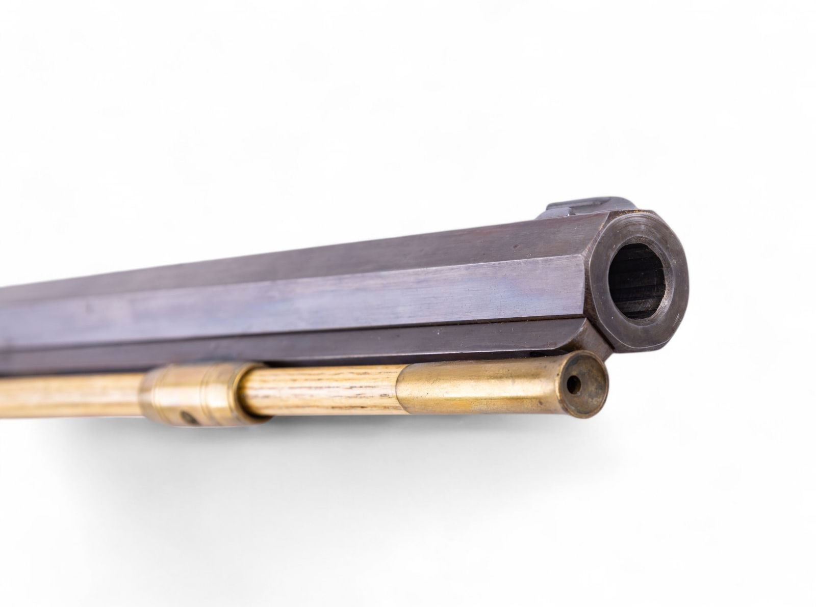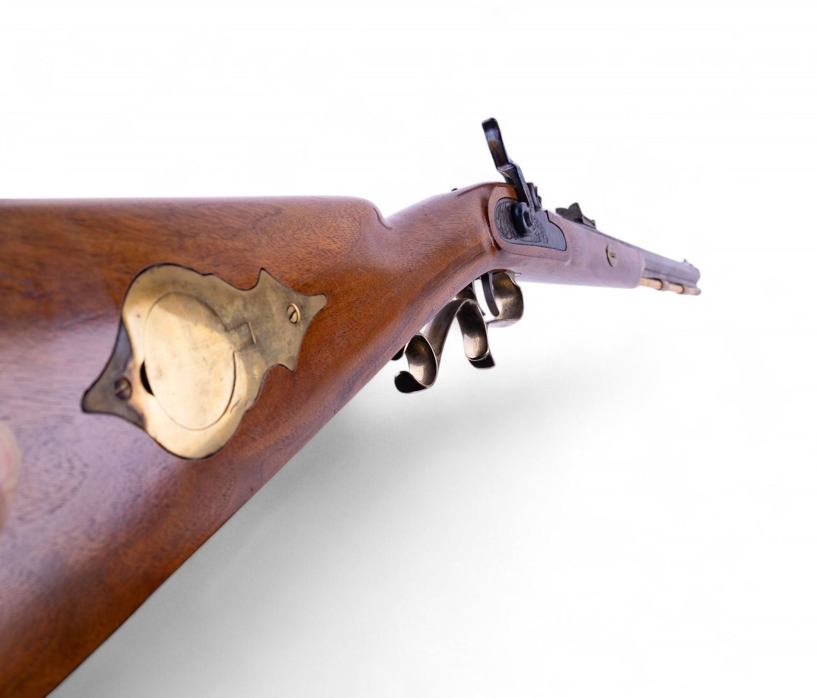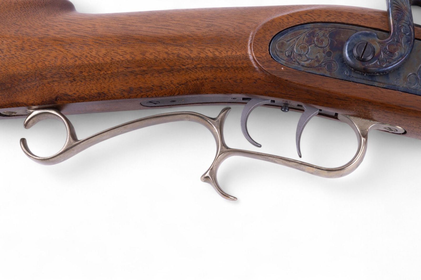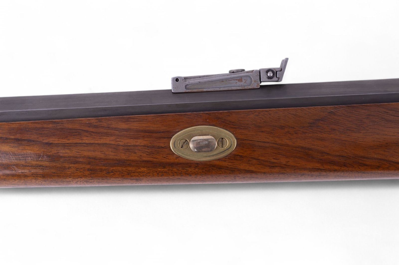 Muzzle loading hunting rifle design and per the booklet, it is "designed after the early 1800's Hawken Brothers rifle. Constructed of steel, American Walnut stock, solid brass trim, double set of triggers, hooked breach system, adjustable hunting sights, and heavy duty coil main spring for lifetime dependability." Brass patch box, percussion cap. 33 page insstruction booklet "Shooting Black Powder Guns / Thompson / Center Arms Company" included along with oils, lubricant, patches, solvent, tape, black powder measure, small tools, and a pouch of round ball bullet moulds. Case approx 48" L x 10.5" W x 4" D.