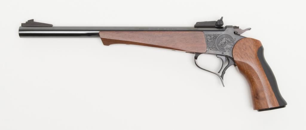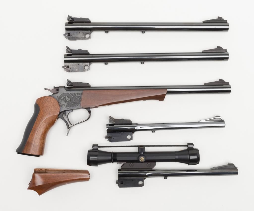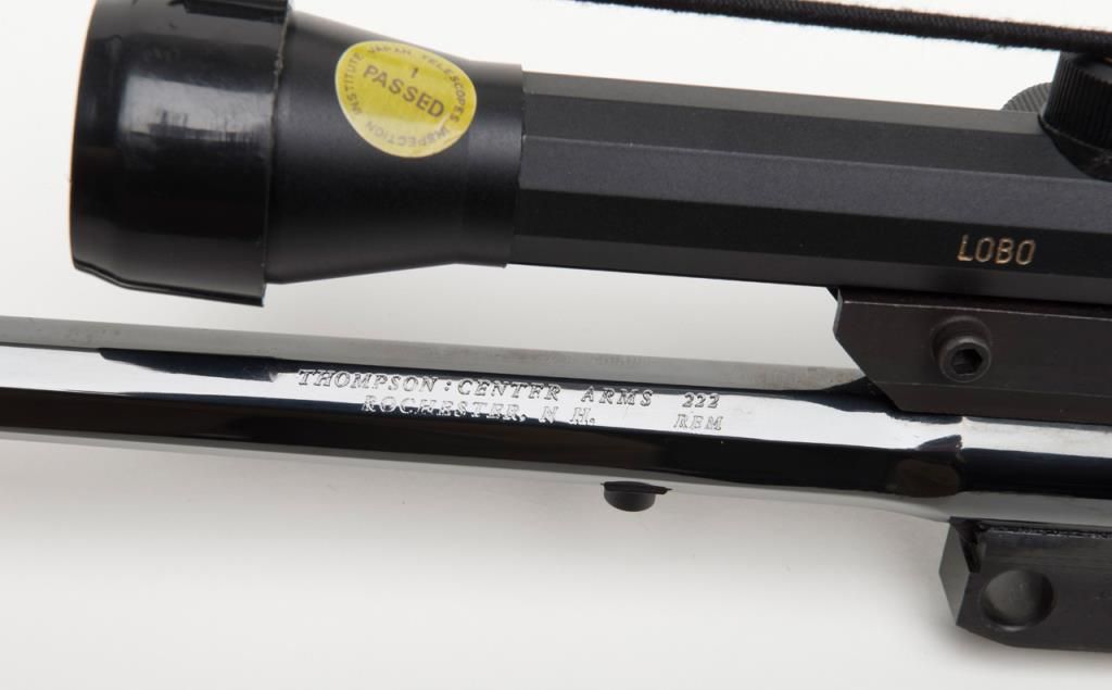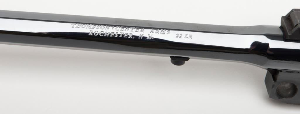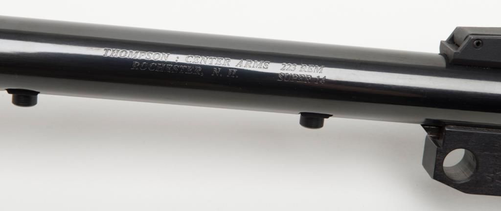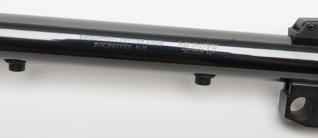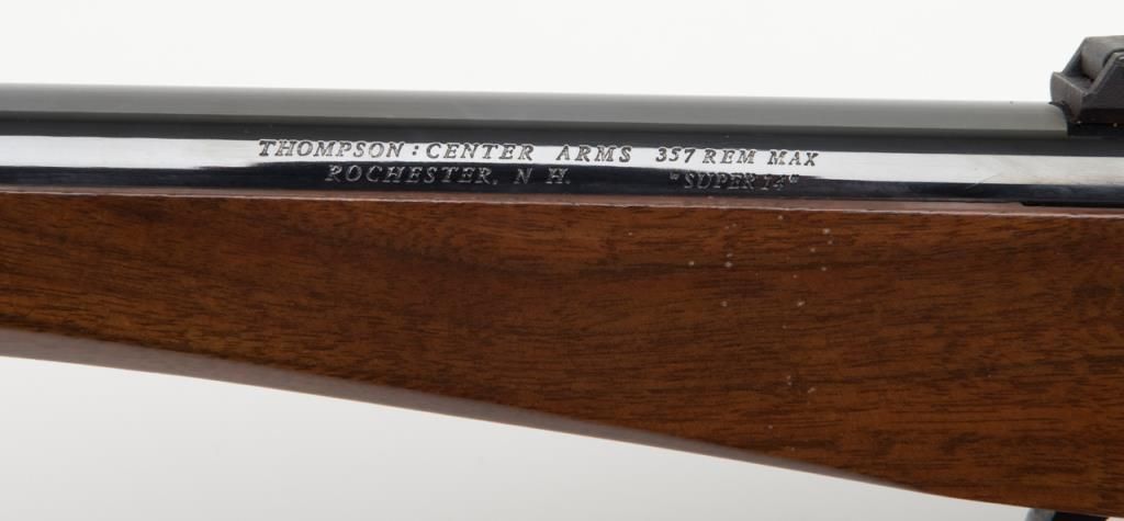 Thompson Center Arms Contender “Super 14” single shot tip-up pistol, .357 Rem. Max. cal., 14” round barrel, blue finish, smooth wood stock and forend, #346221 in overall fine condition showing little use; a couple scratches to the left side of the stock from storage; accompanied by 4 additional barrels and an additional forend: barrels consisting of: 1. Super 14 in 7-30 Waters cal.; 2. Super 14 in .223 Rem. cal.; 3. 10” barrel in .22LR cal., and 4. 10” barrel in .222Rem. cal. mounted with a Lobo 3X scope with clear optics; all in fine condition. (Modern/PPT). Est.: $400-$800.