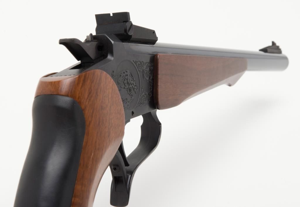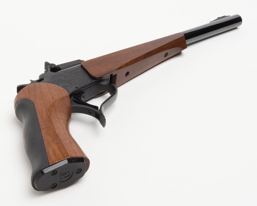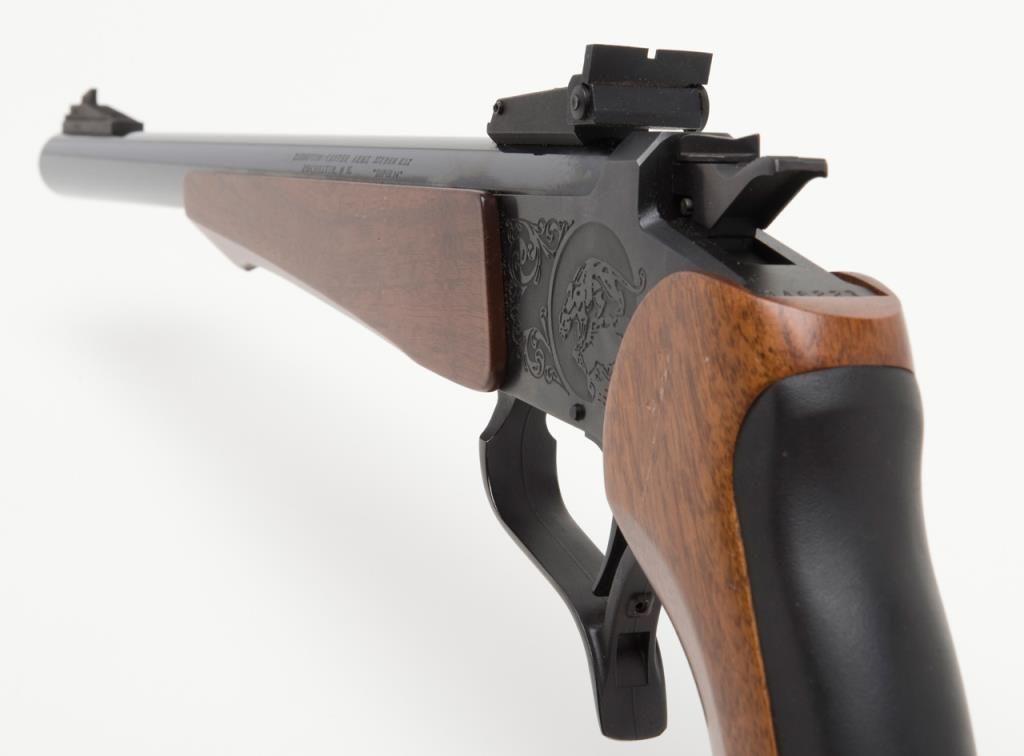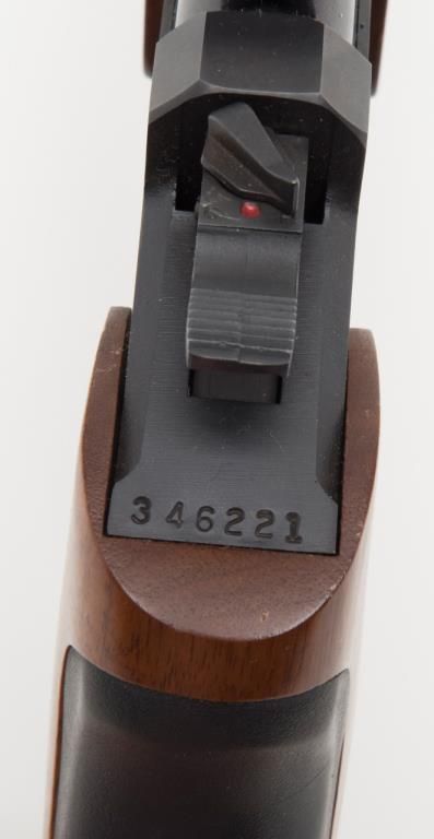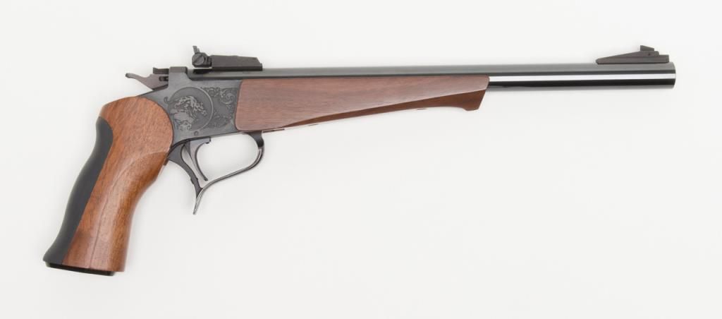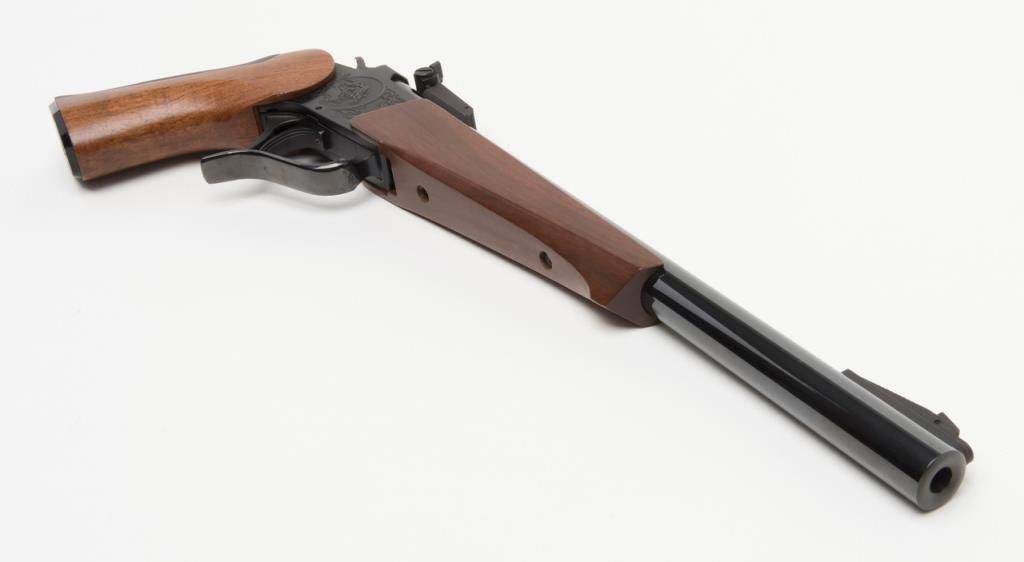 Thompson Center Arms Contender “Super 14” single shot tip-up pistol, .357 Rem. Max. cal., 14” round barrel, blue finish, smooth wood stock and forend, #346221 in overall fine condition showing little use; a couple scratches to the left side of the stock from storage; accompanied by 4 additional barrels and an additional forend: barrels consisting of: 1. Super 14 in 7-30 Waters cal.; 2. Super 14 in .223 Rem. cal.; 3. 10” barrel in .22LR cal., and 4. 10” barrel in .222Rem. cal. mounted with a Lobo 3X scope with clear optics; all in fine condition. (Modern/PPT). Est.: $400-$800.