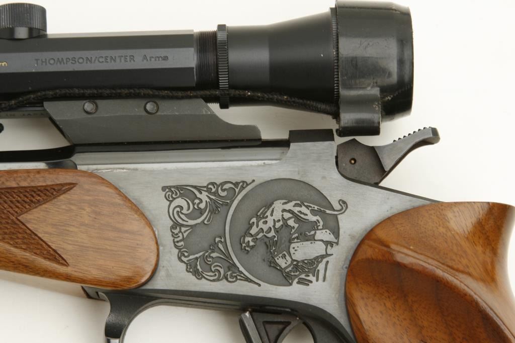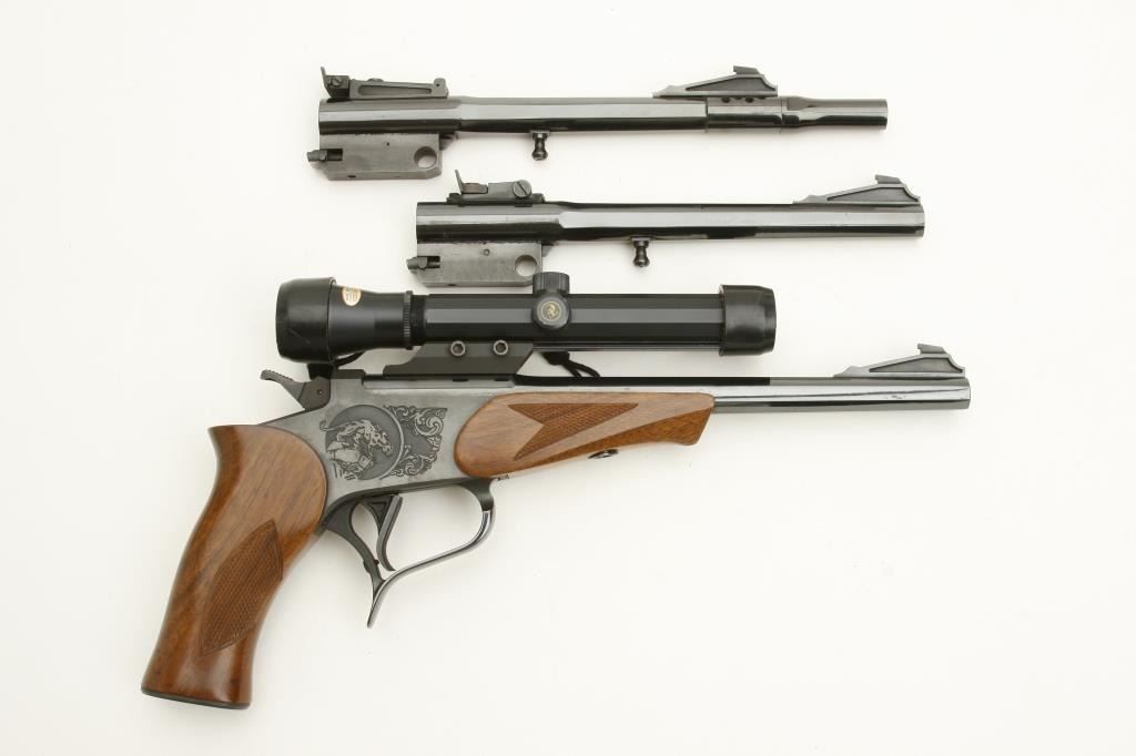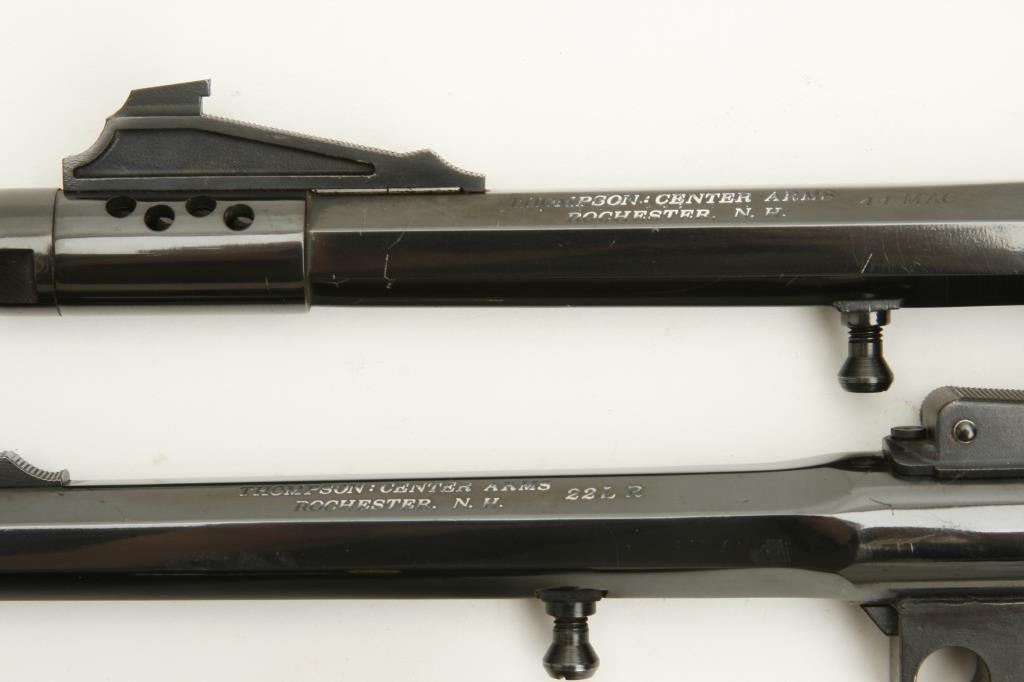 Magnum caliber, 10” barrel with two extra barrels, one is a 9” .22LR caliber, the other is a 10” ported .44 Magnum caliber, all are blued; the frame has a checkered wood grip and checkered wood forend, S/N 65605, in overall fine condition with fine bores, crisp action, majority of original finish and mounted with a Puma 1.5 X17mm scope displaying good optics. (Modern/PPT). Est.: $300-$600.
