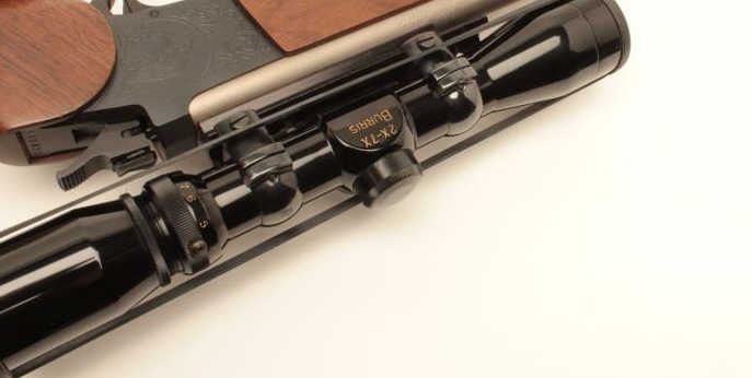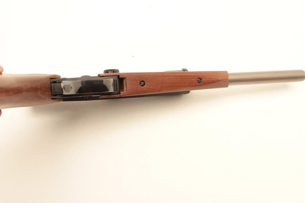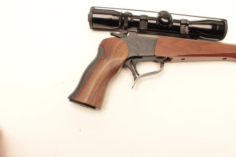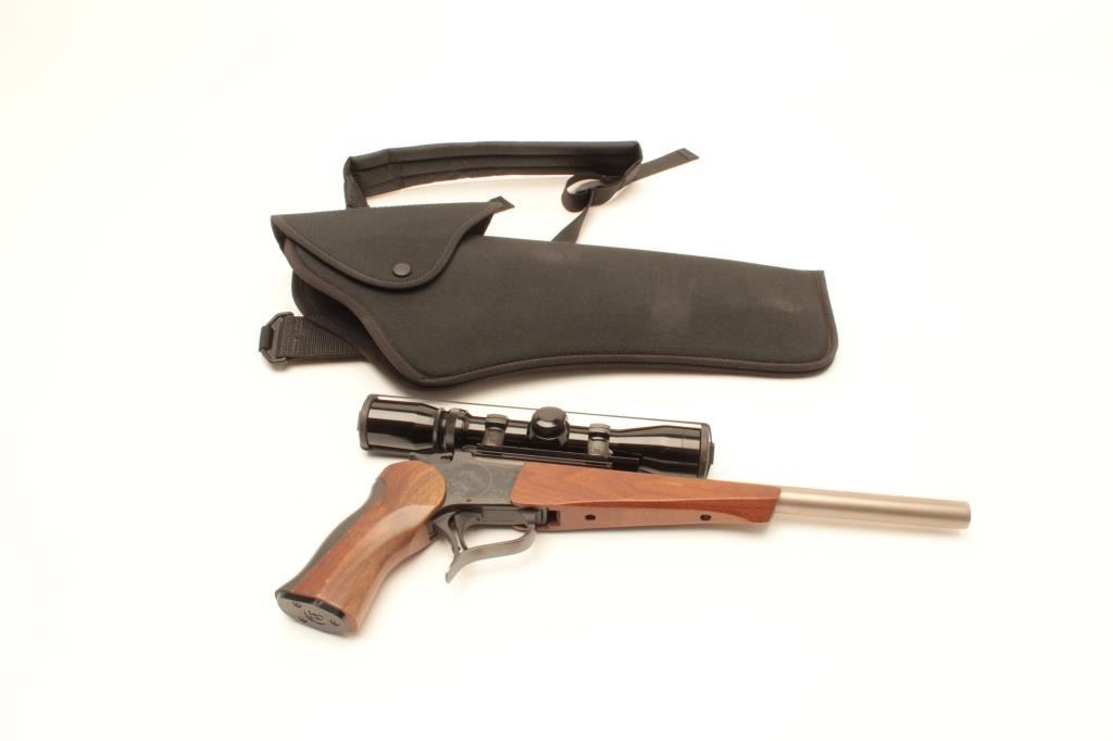 Thompson Center Arms Contender single shot pistol, Super 14 Model, .223 Rem. caliber, 14” barrel, stainless, wood grip and forend, S/N 440421, mounted with a Burris 2X-7X scope, accompanied by a woven fabric holsterand shoulder strap along with a second barrel assembly, 10” overall with wood forend, .223 Rem. caliber, in factory cardboard box with set of sights. This gun is in overall fine condition showing the majority of itsoriginal finish, very good to fine bores, crisp action, sharp markings and fine wood. (Modern/No PPT). Est.: $350-$700.