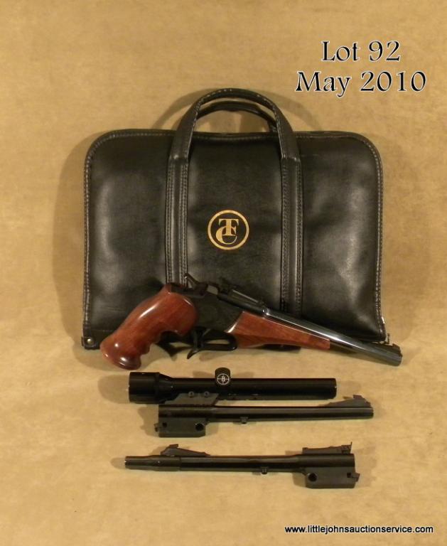 Thompson Center Arms Contender single shot pistol with two extra barrel assemblies; gun is in .22LR cal., 10” barrel, blue finish, wood stocks, #68069. This gun is in overall excellent condition showing approx. 98% original finish, very goodbore, crisp action and markings, fine wood. The is accompanied by a Contender leather soft case containing the two extra barrels and tools; one barrel is in .44 Mag. cal., 10” barrel and in excellent condition mounted with a Bushnell Magnum Phantom 2.5X scope; the second barrel is in .357 Mag. cal., 8-3/4” barrel with removable muzzle device to permit use of shot cartridges. This barrel also is in excellent condition with a fine bore. A great set for the serious shooter. Est.: $300-$500.