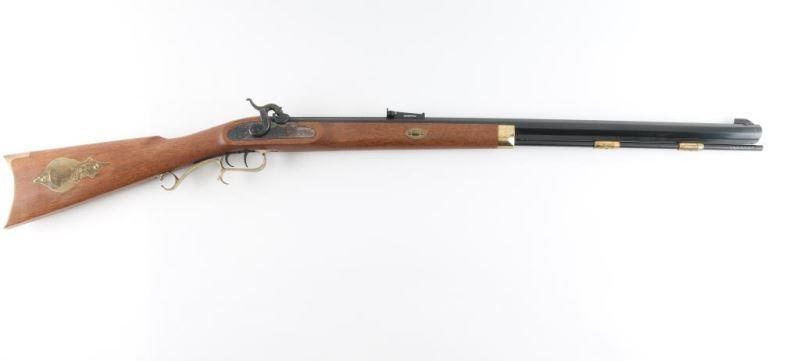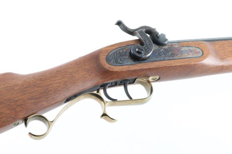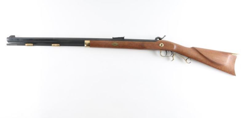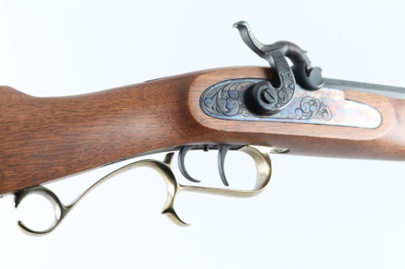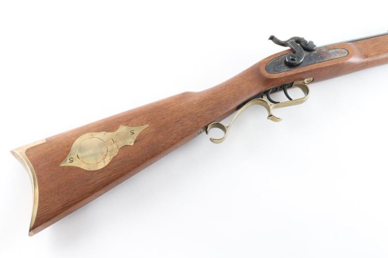 Rifle. Single-Shot. Blackpowder, percussion rifle. A copy of the famous "Hawken". 28" octagon barrel with post/bead front and adjustable u-notch rear sights. Blued polished barrel. Case-hardened lock plate/hammer. Solid brass triggerguard, patch box, butt plate, fore cap, and ramrod rings. American walnut stock with left contoured cheek piece. Fully adjustable triggers function as double set or single stage. Bore appears excellent, but dusty. Two-stage hammer locks up tight. Metal finish is near excellent. Wood is very good with with some minor dings. Brass is tarnished and needs to be polished. NRA Condition-Near Excellent. Antique Firearm.