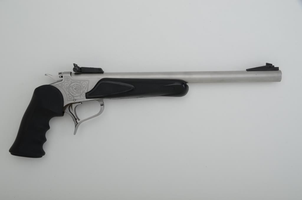 Thompson Center Arms Super 14 Model tip-up single shot pistol, .30-30 Win. cal., 14” heavy round barrel, brushed stainless steel, finger grooved hard rubber grips and checkered hard rubber fore arm, #S5221. Thisgun is in overall fine condition with a fine bore, crisp action, sharp markings and fine grips; hammer has two position adjustment for Centerfire and Rimfire; accompanied by 4 additional barrels including: 1) a bluedSuper 14” round barrel in factory cardboard box in .35 Rem. caliber with adjustable rear sight in excellent condition; 2) a blued 10” Herrett round barrel, .357 cal., in excellent condition; 3) a brushed stainless steelSuper 14” round barrel, 7-30 Waters cal., in fine condition and 4) a blued 10” round barrel, 7mm T/CU cal., in excellent condition; a fine grouping of barrels with the popular Thompson Center Arms pistol.Est.: $500-$800.