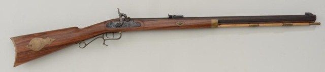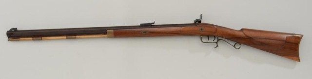 Thompson Center Arms modern copy of a percussion half stock plains type rifle, .50 cal., 28” octagon barrel, brown finish, case colored hammer and lock plate, brass mountings, double set triggers, #K113445.This gun is in fine condition showing little use. Est.: $100-$200.