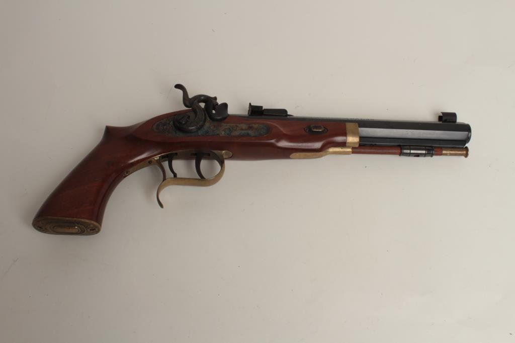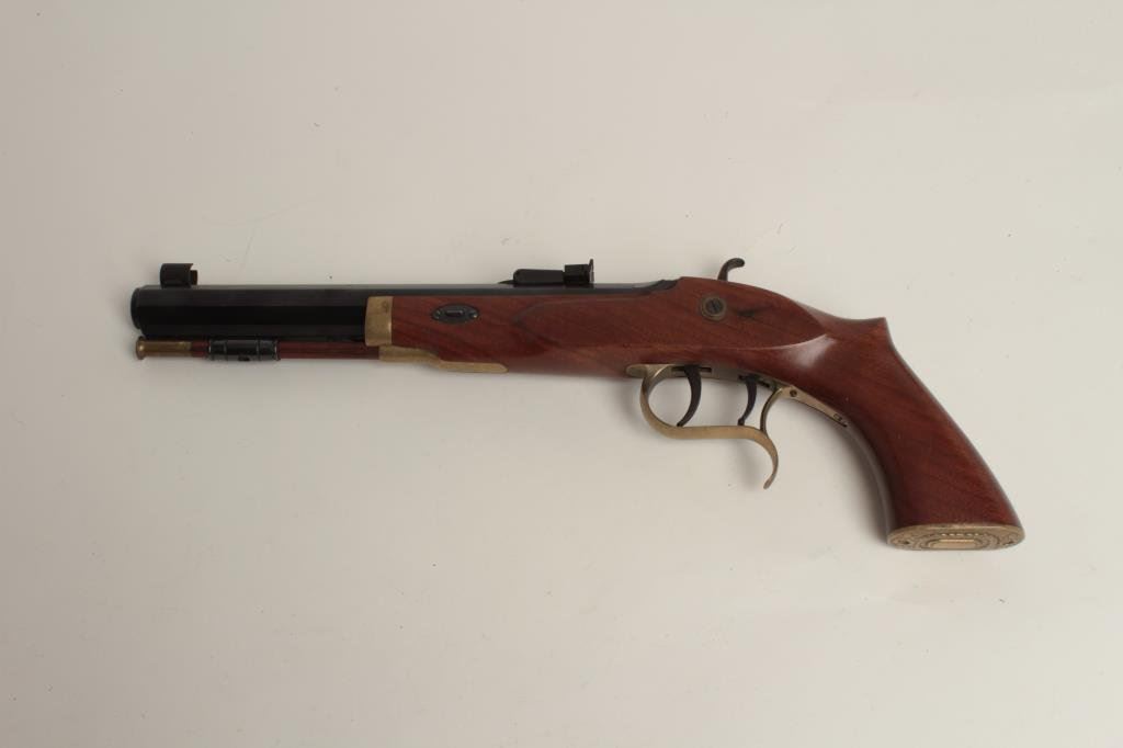 shot pistol, .45 caliber, 9” octagon barrel, blued and case hardened finish, wood stock, double set triggers, S/N 33352, in overall near new condition. (Percussion). Est.: $100-$200.