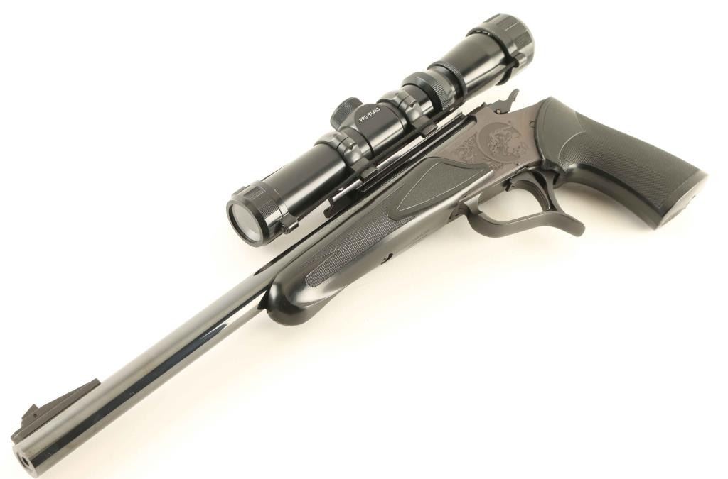Modular break-action single shot pistol chambered in .223 Remington utilizing a 1979 vintage frame. Features a blued finish, "Super 14" 14" heavy barrel with recessed crown, raised patridge front sight, Tasco Pro-Class 1.25-4x scope, smooth trigger with serrated edges & adjustable overtravel stop in the trigger guard, engraved cougar scene on the receiver, three-position firing pin selector/safety switch on the hammer, and two-piece Pachmayr Presentation checkered black rubber stocks. Pistol retains approximately 95% of it's blued finish with bright bluing on the barrel and a plum appearance on the receiver, both showing only light wear. Action is crisp, the bore appears excellent but slightly dirty, and the rubber stocks are good as the pistol grip has been shortened(cut) at the front near the trigger guard. Condition is NRA Very Good+++. ***Modern Firearm***